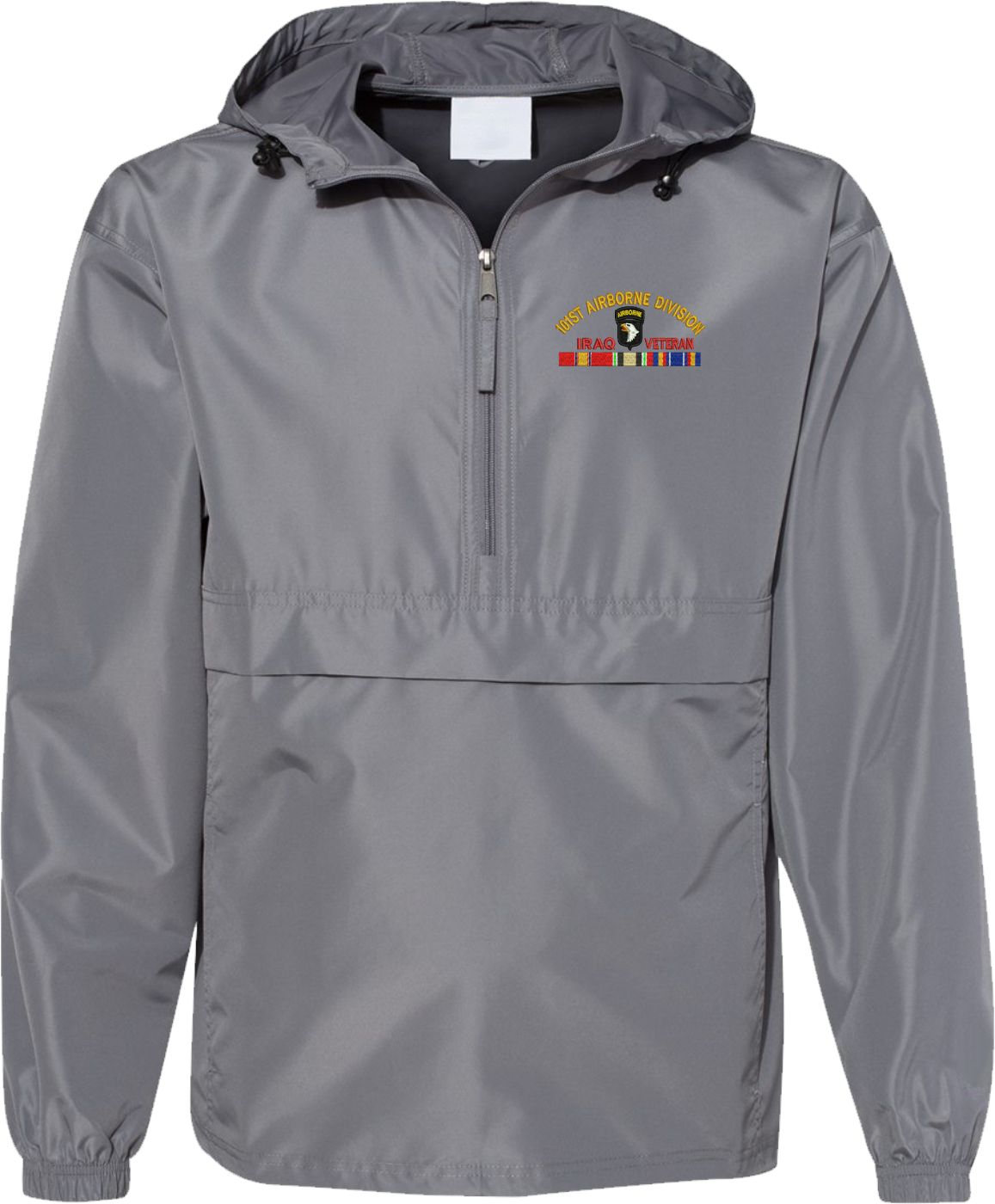 MilitaryBest is proud to offer this quality 101st Airborne Division Iraq Veteran with Ribbons Hooded Windbreaker. Also known as an Anorak Jacket, this windbreaker is designed to keep wind and water out. With a design embroidered over the left chest, this windbreaker is embroidered to order at our facilities in Scottsboro, AL.. This windbreaker can be packed into the mesh lined pouch pocket for a more portable method of storage.- 100% Polyester