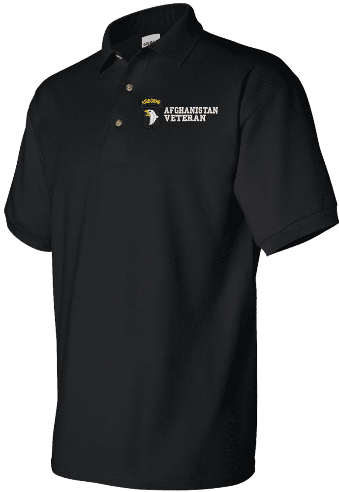 Note: Some of the Color Options pictured may not be available. Available Color Options are listed on the drop down menu above.MilitaryBest is proud to offer this quality 101st Airborne Division Afghanistan Veteran Polo. Each Polo is available in either 100% Ringspun cotton pique or a 50/50 cotton/polyester blend. These quality Military Polos are proudly embroidered at our facilities in Scottsboro, AL. Support the Army MWR program by purchasing only from Licensed Vendors.