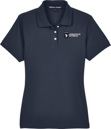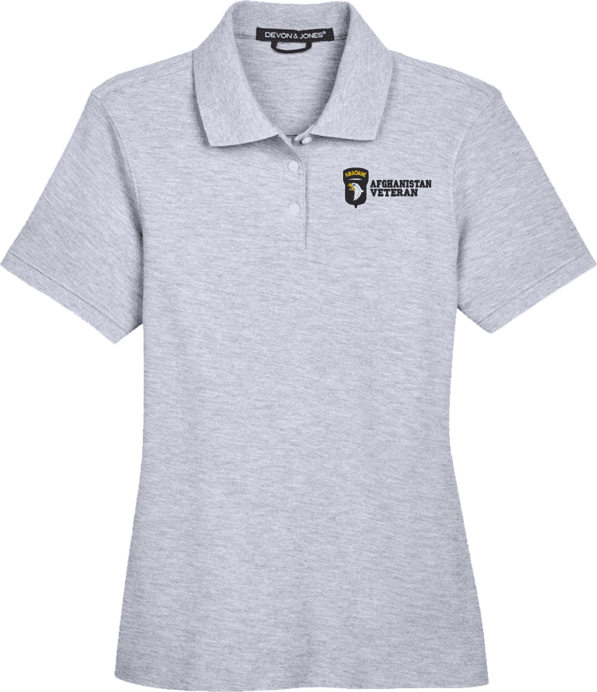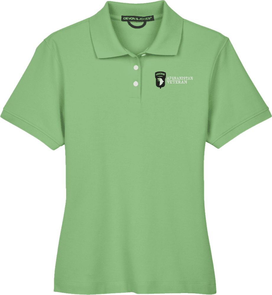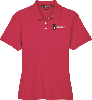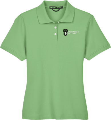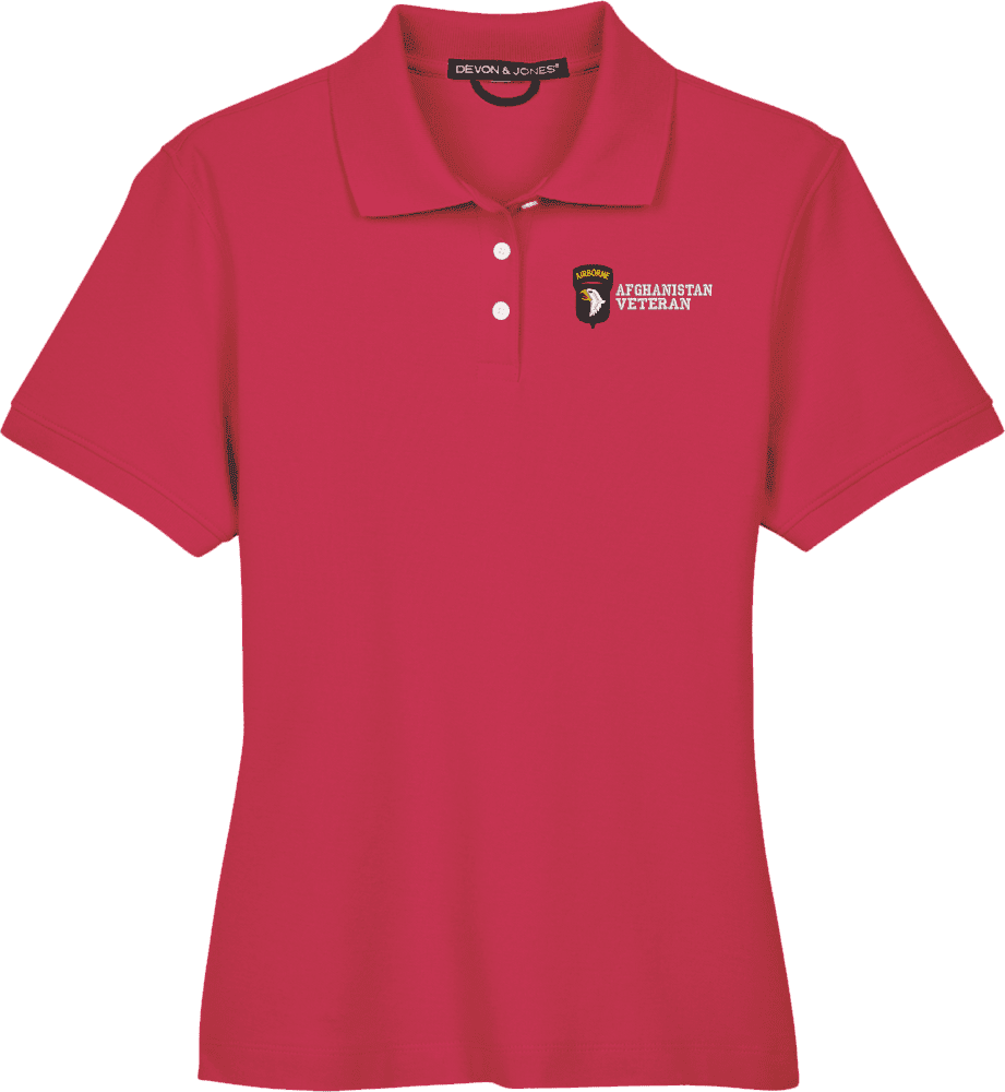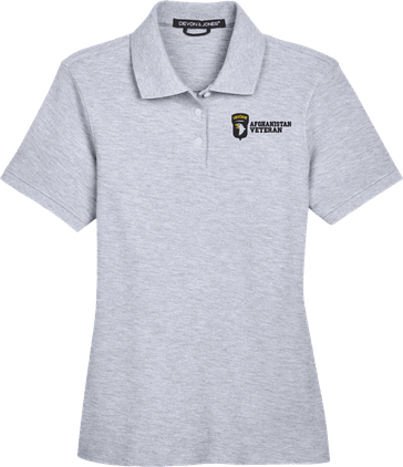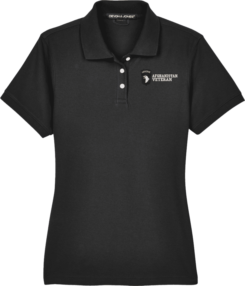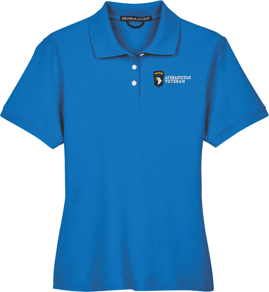 Note: Some of the Color Options pictured may not be available. Available Color Options are listed on the drop down menu above.MilitaryBest is proud to offer this 101st Airborne Division Afghanistan Veteran Women's Devon & Jones Polo. This Ladies Polo features Rib knit cuffs, Dura-Pearl Buttons, and a Three-Button Placket. These Polos are made with 6.8 oz., 100% Peruvian Pima Cotton and are proudly embroidered at our facilities in Scottsboro, AL.