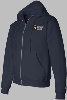 MilitaryBest is proud to offer this quality 101st Airborne Division United States Army Zippered Hoodie. Each U.S. Army Zippered Hoodie is direct embroidered onto either a Champion or Gildan brand Zippered Hoodie using a 9.5 oz 50/50 Cotton Poly blend material. These Military Zippered Hoodies are proudly embroidered at our facilities in Scottsboro, AL.