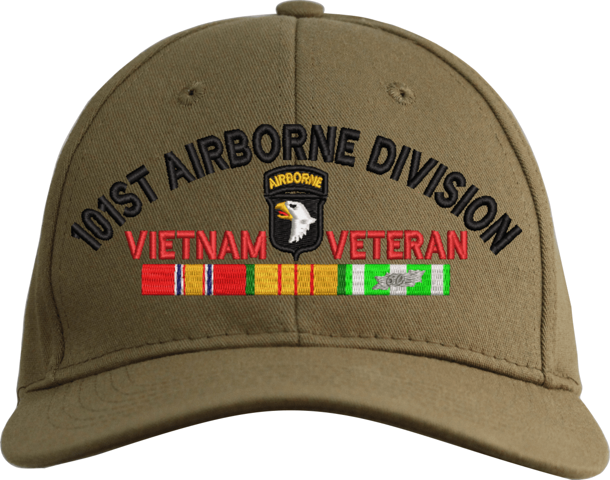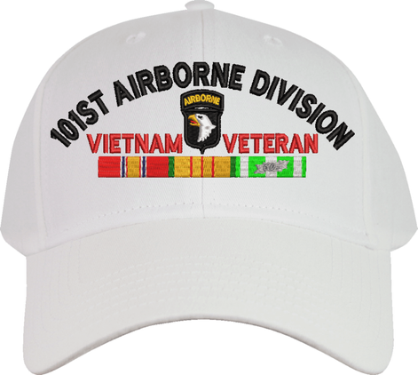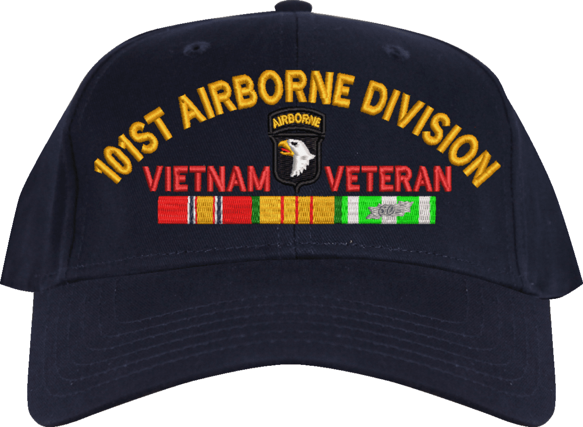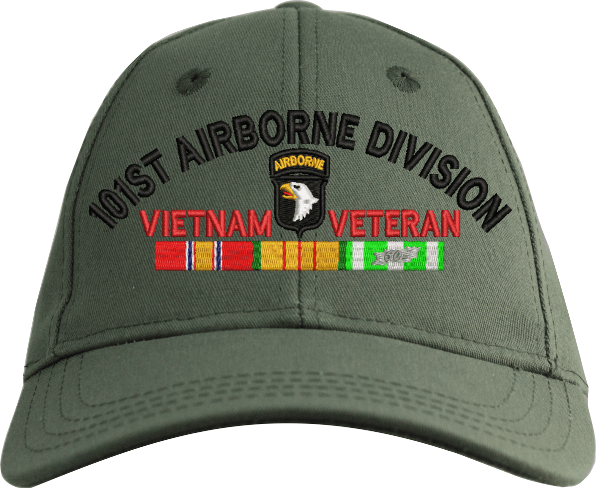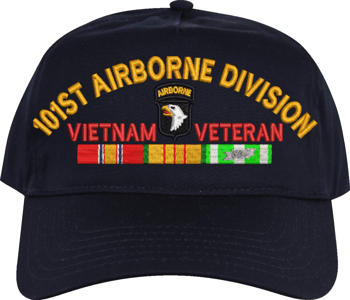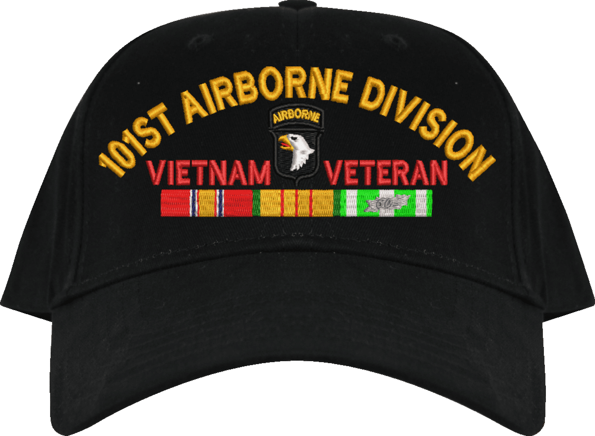 MilitaryBest is proud to offer this 101st Airborne Division Vietnam Veteran Embroidered Cap with Ribbons. This cap is available in a 5 panel high profile or 6 panel low profile styling. All our caps are made from top quality materials. This cap would make a wonderful addition to your collection or a great gift! All custom embroidery is done at our facility in Scottsboro, AL.