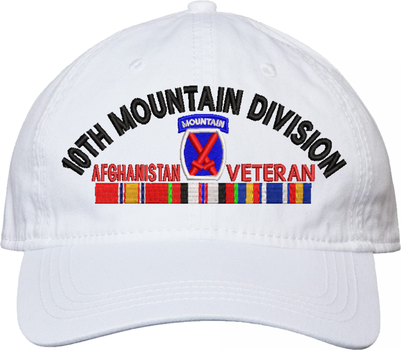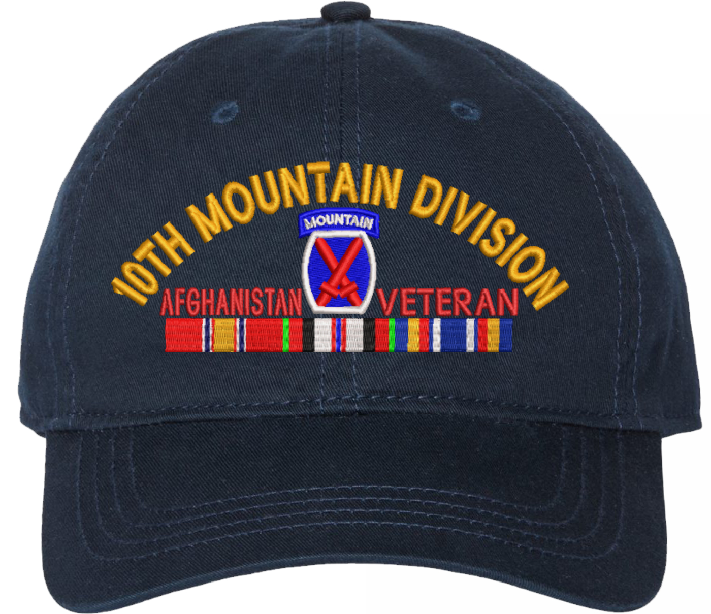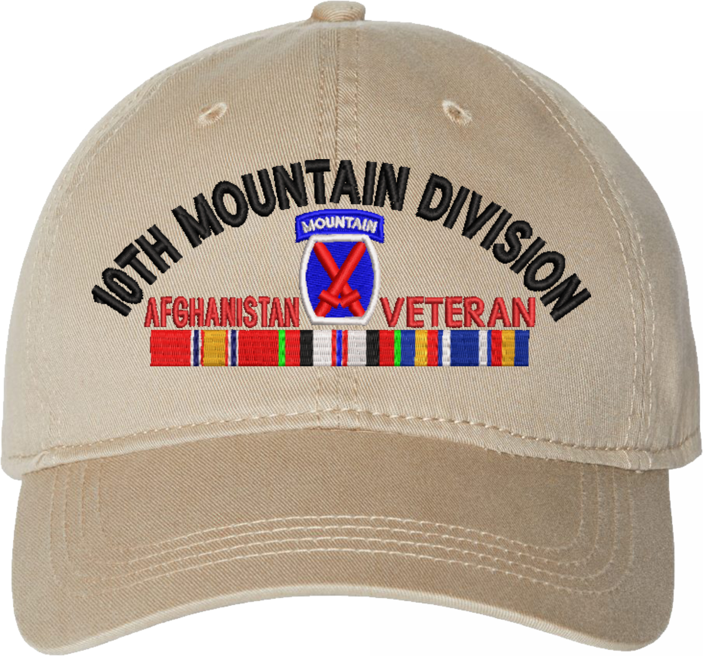 Show your Army pride with this 10th Mountain Division Afghanistan Veteran with Ribbons Unstructured Dad Cap from MilitaryBest. Crafted from 100% washed chino twill cotton, this six-panel, low-profile cap offers a relaxed and comfortable fit. Featuring high-quality embroidery done in our Scottsboro, Alabama facility, this cap is designed with a pre-curved visor and an adjustable tri-glide buckle closure for a perfect fit. Whether for everyday wear or as a meaningful gift, this cap is a great way to honor your own or a loved one's service.For caps ordered with custom embroidered personalized text please allow an additional 3 to 5 days production time. All custom back text will be embroidered in ALL CAPITAL LETTERS. Caps with back text or eggs are non-returnable unless there is a material defect in the cap.