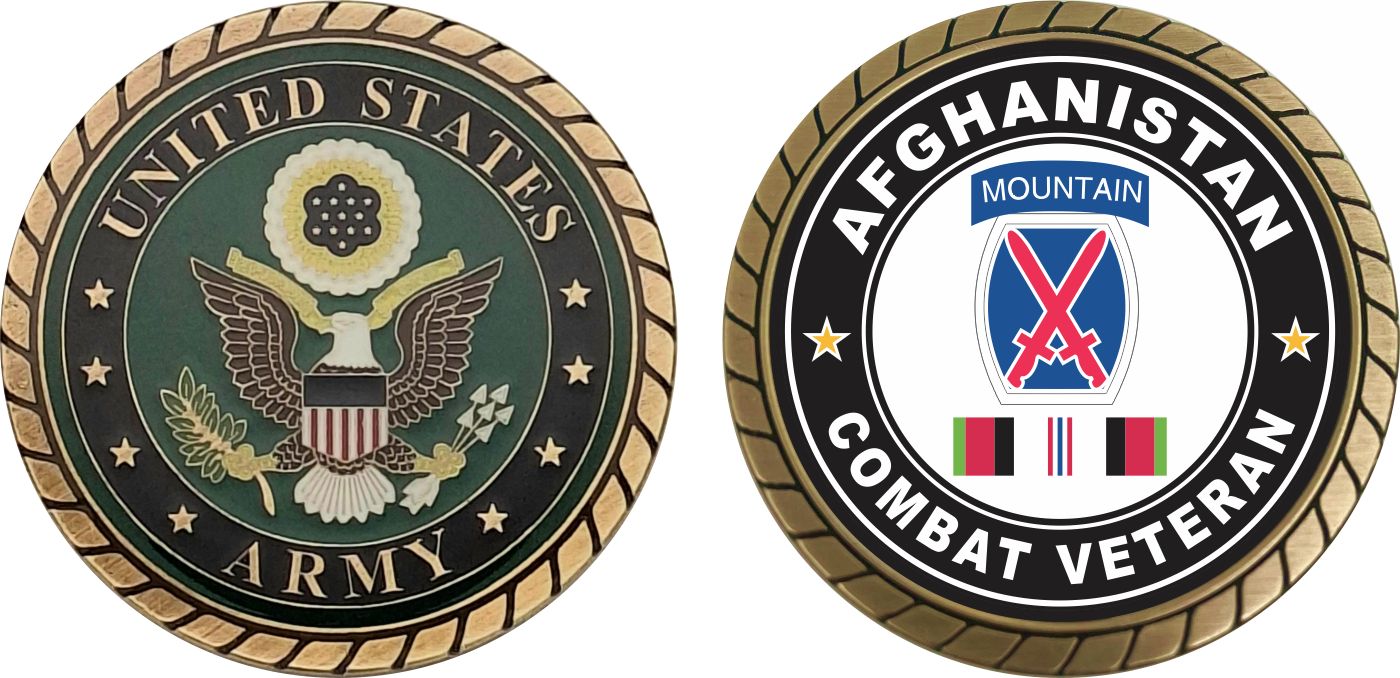 This 1 3/4” 10th Mountain Division Afghanistan Combat Veteran Challenge Coin is proudly offered by MilitaryBest. This Officially Licensed Army coin has beautiful enamel finish on one side and an organized crisp clean 10th Mountain Division Afghanistan Combat Veteran design on the opposite side.