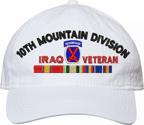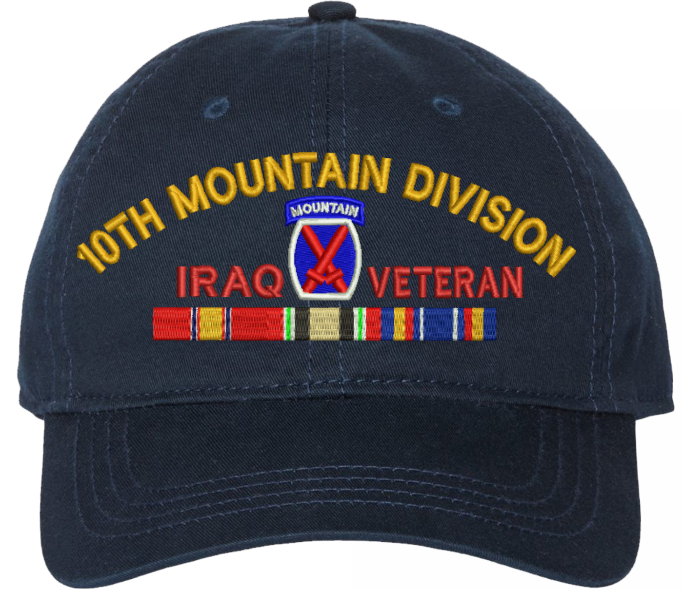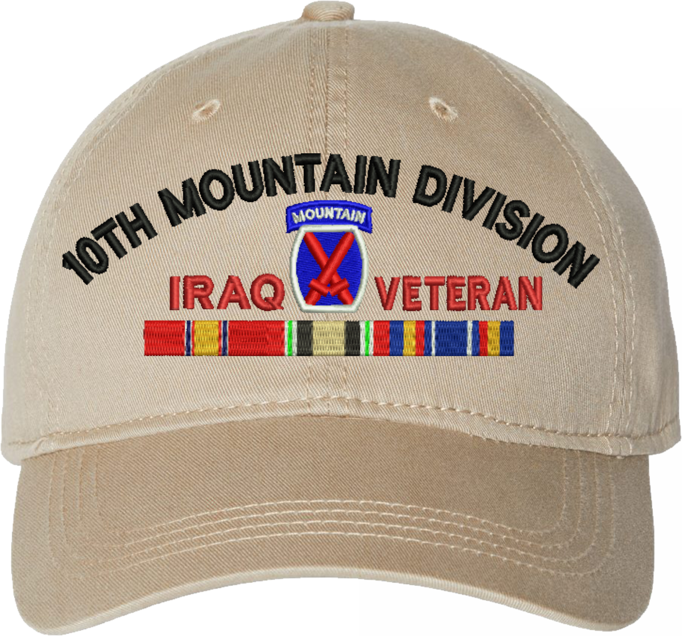 Show your Army pride with this 10th Mountain Division Iraq Veteran with Ribbons Unstructured Dad Cap from MilitaryBest. Crafted from 100% washed chino twill cotton, this six-panel, low-profile cap offers a relaxed and comfortable fit. Featuring high-quality embroidery done in our Scottsboro, Alabama facility, this cap is designed with a pre-curved visor and an adjustable tri-glide buckle closure for a perfect fit. Whether for everyday wear or as a meaningful gift, this cap is a great way to honor your own or a loved one's service.For caps ordered with custom embroidered personalized text please allow an additional 3 to 5 days production time. All custom back text will be embroidered in ALL CAPITAL LETTERS. Caps with back text or eggs are non-returnable unless there is a material defect in the cap.