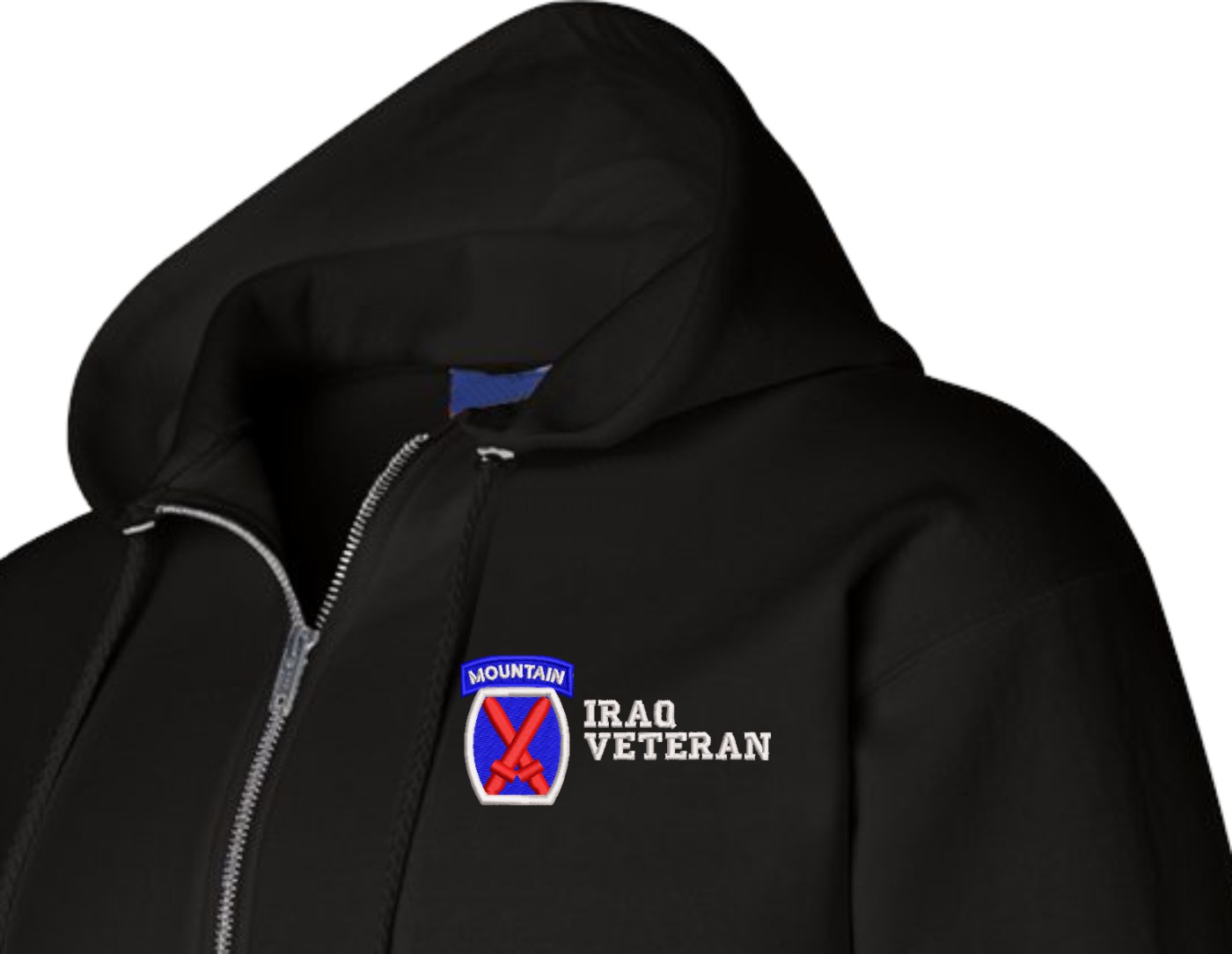 MilitaryBest is proud to offer this quality 10th Mountain Division Iraq Veteran Zippered Hoodie. Each U.S. Army Zippered Hoodie is direct embroidered onto either a Champion or Gildan brand Zippered Hoodie using a 9.5 oz 50/50 Cotton Poly blend material. These Military Zippered Hoodies are proudly embroidered at our facilities in Scottsboro, AL.
