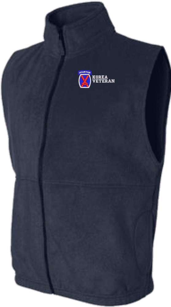 Due to supply chain disruptions, some colors and sizes may not be available in the same Brand, in these cases a brand of comparable quality will be used. Feel free to call in advance of your order, with questions you may have.MilitaryBest is proud to offer this quality 10th Mountain Division Korea Veteran Full-Zip Fleece Vest. Our U.S. Army Full Zip Fleece Vest features a convertible collar with dyed-to-match zipper pull and oversized nylon reinforced slash pockets. These Military Vests are proudly embroidered at our facilities in Scottsboro, AL.