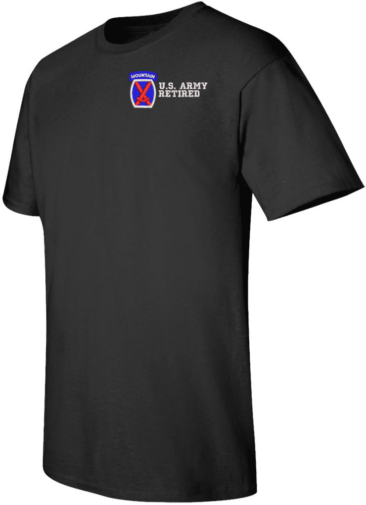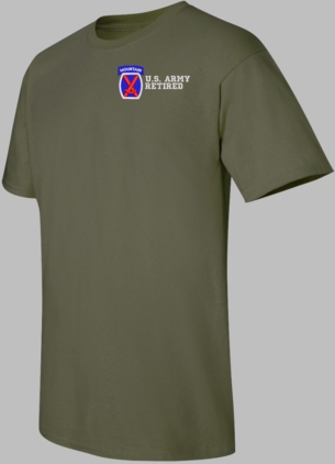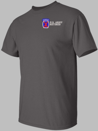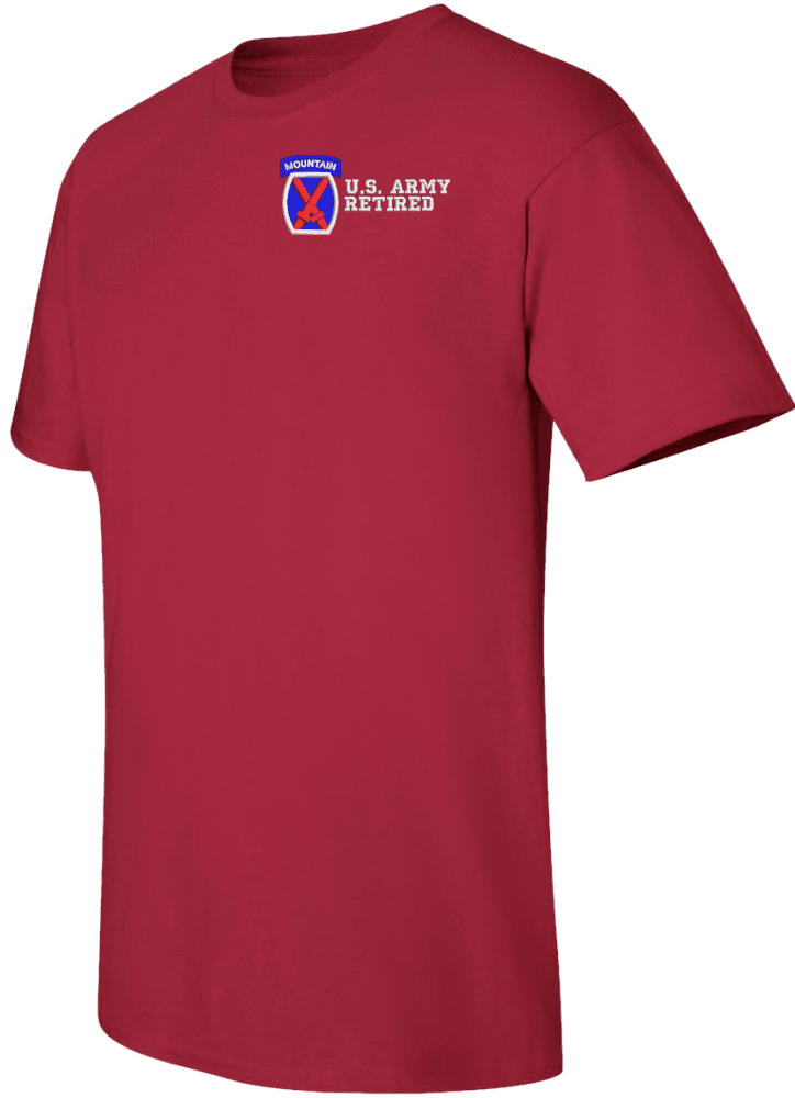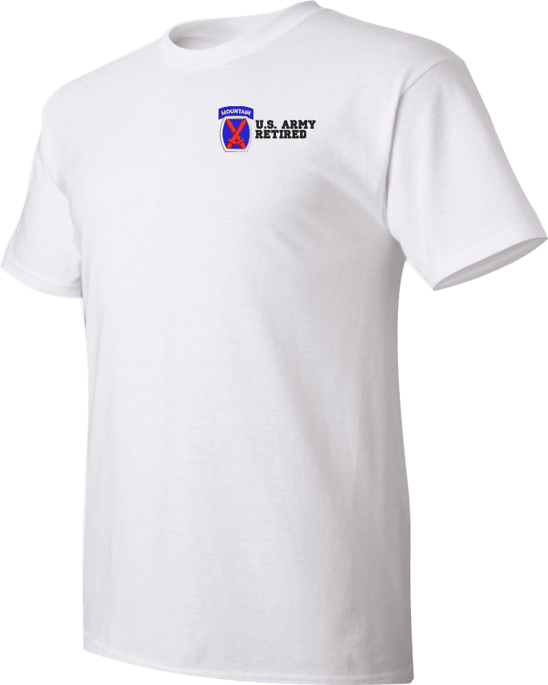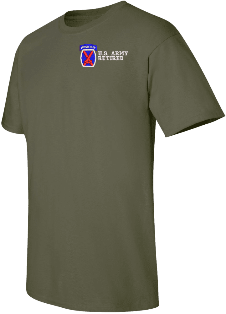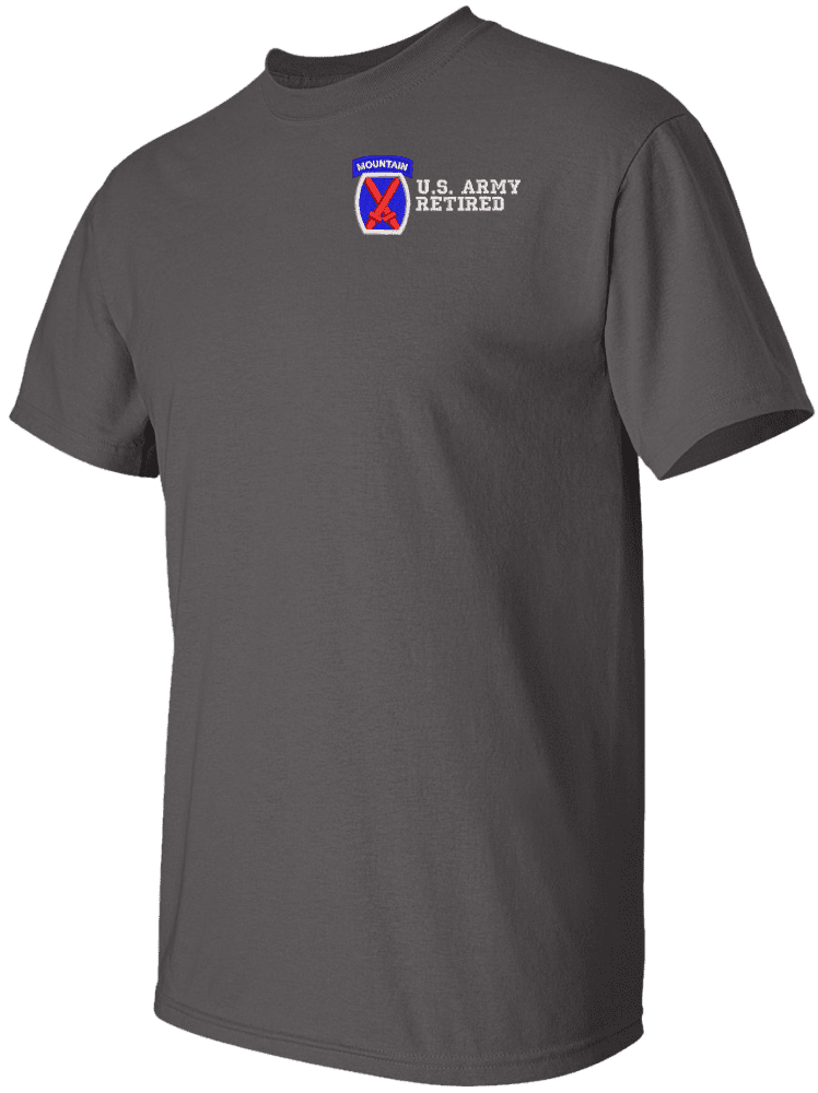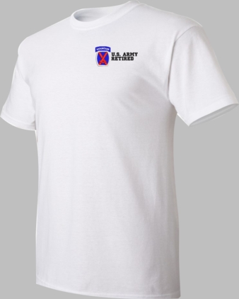 Note: Some of the Color Options pictured may not be available. Available Color Options are listed on the drop down menu above.MilitaryBest is proud to offer this quality 10th Mountain Division Retired T Shirt. This Gildan brand short sleeve t-shirt is made using a 6 oz pre-shrunk 100% cotton material. These quality Military T Shirts are proudly embroidered at our facilities in Scottsboro, AL. Support the Army MWR program by purchasing only from Licensed Vendors.