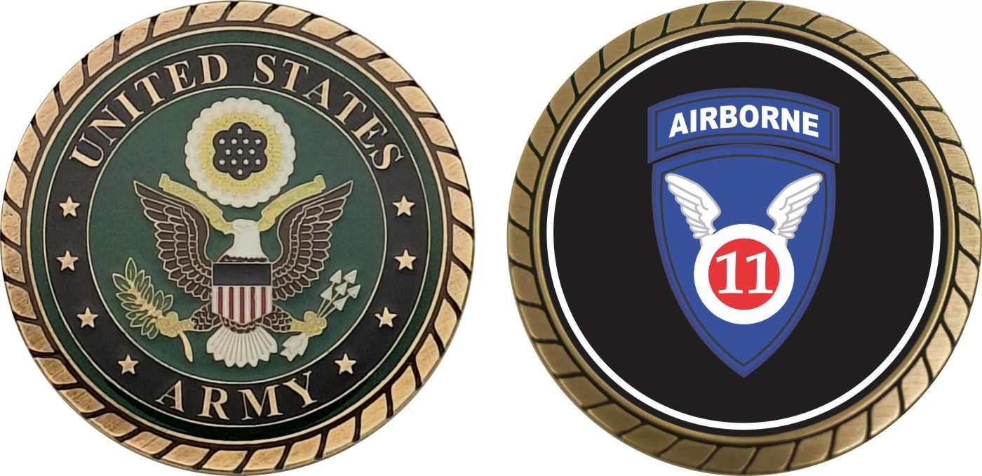 This 1 3/4” 11th Airborne Division Window Challenge Coin is proudly offered by Militarybest. This Officially Licensed Army coin has beautiful enamel finish on one side and an organized crisp clean design on the opposite side.