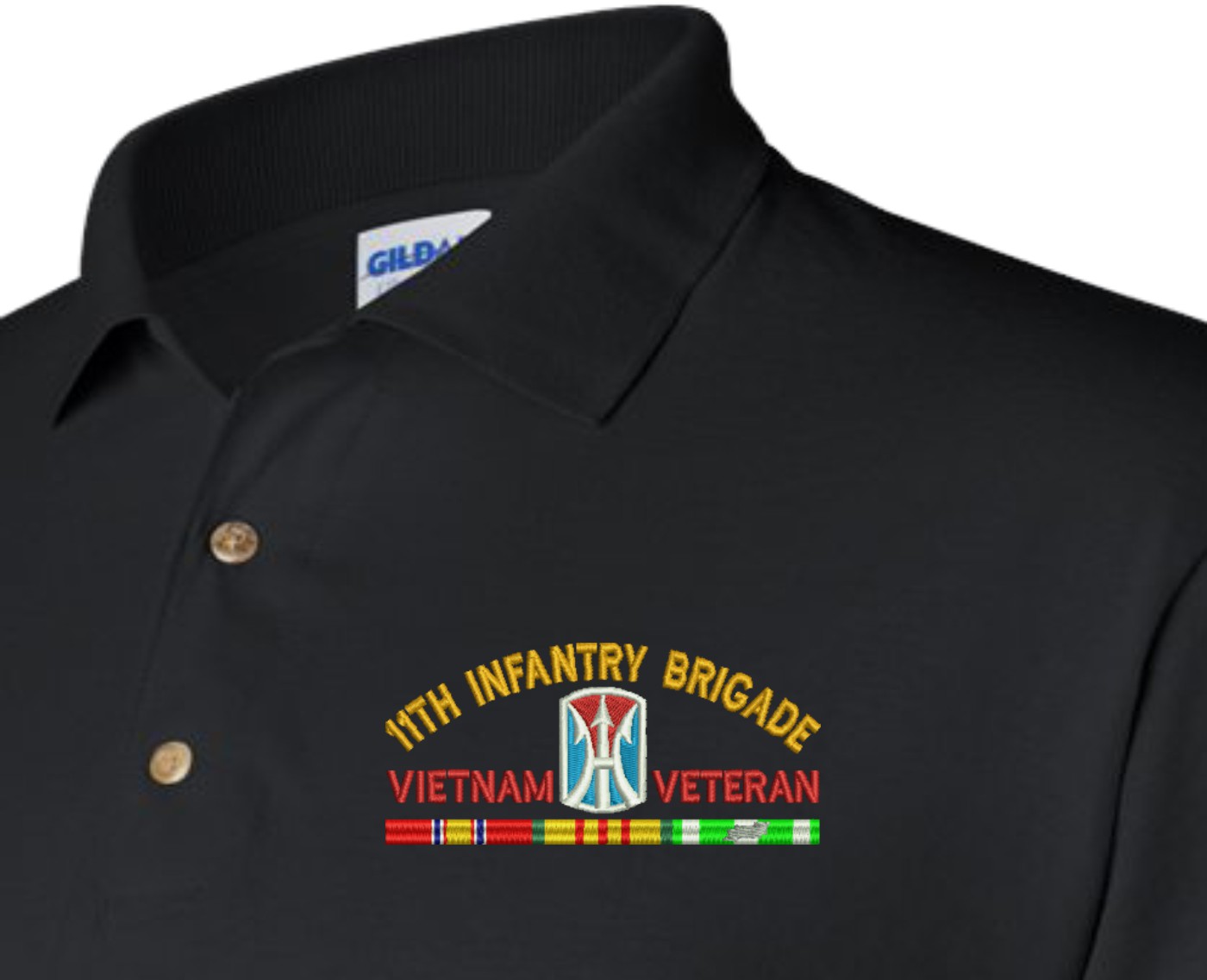 MilitaryBest is proud to offer this quality U.S. Army 11th Infantry Brigade Vietnam Veteran with Ribbons Embroidered Polo. Each Polo is available in either 100% Ringspun cotton pique or a 50/50 cotton/polyester blend. These quality Military Polos are proudly embroidered at our facilities in Scottsboro, AL. Support the Army MWR program by purchasing only from Licensed Vendors. To all of our Vietnam Veterans, Welcome Home!