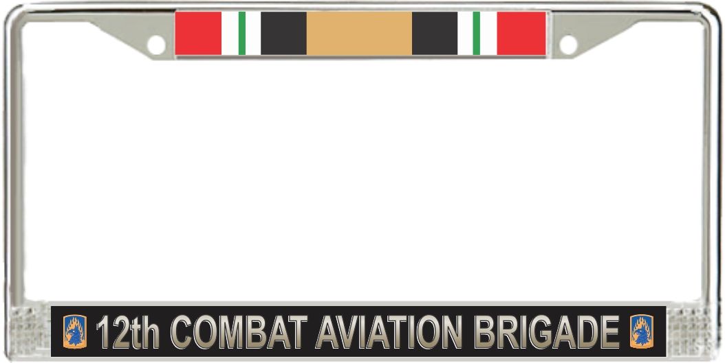 12th Aviation Brigade Iraq Veteran License Plate FrameThis U.S. Army 12th Aviation Brigade Iraq Veteran License Plate Frame is made from the highest quality finished metal alloy. Each one is designed to provide years of use. Each is designed and produced in our facility in Scottsboro, Alabama.