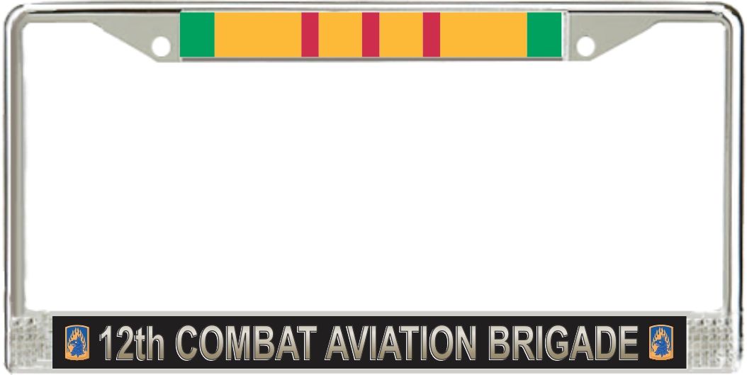 12th Aviation Brigade Vietnam Veteran License Plate FrameThis U.S. Army 12th Aviation Brigade Vietnam Veteran License Plate Frame is made from the highest quality finished metal alloy. Each one is designed to provide years of use. Each is designed and produced in our facility in Scottsboro, Alabama.
