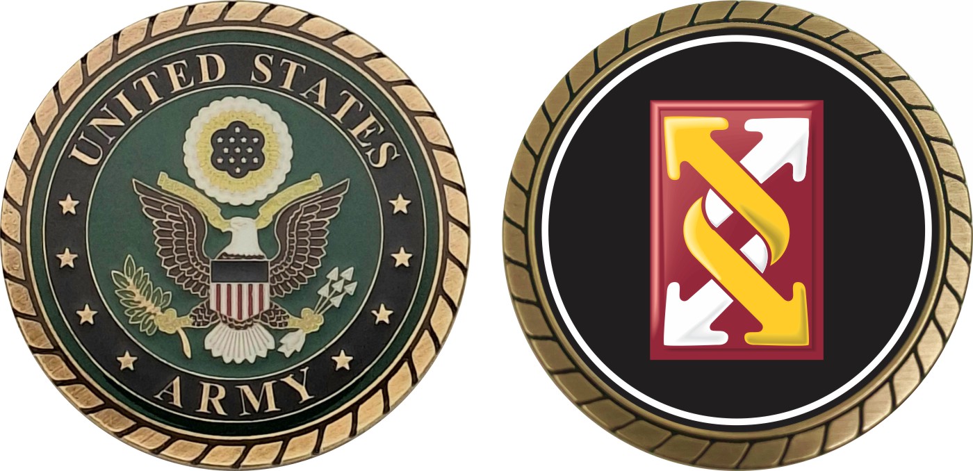 This 1 3/4” 143rd Transportation Command Patch Challenge Coin is proudly offered by Militarybest. This Officially Licensed Army coin has beautiful enamel finish on one side and an organized crisp clean design on the opposite side.