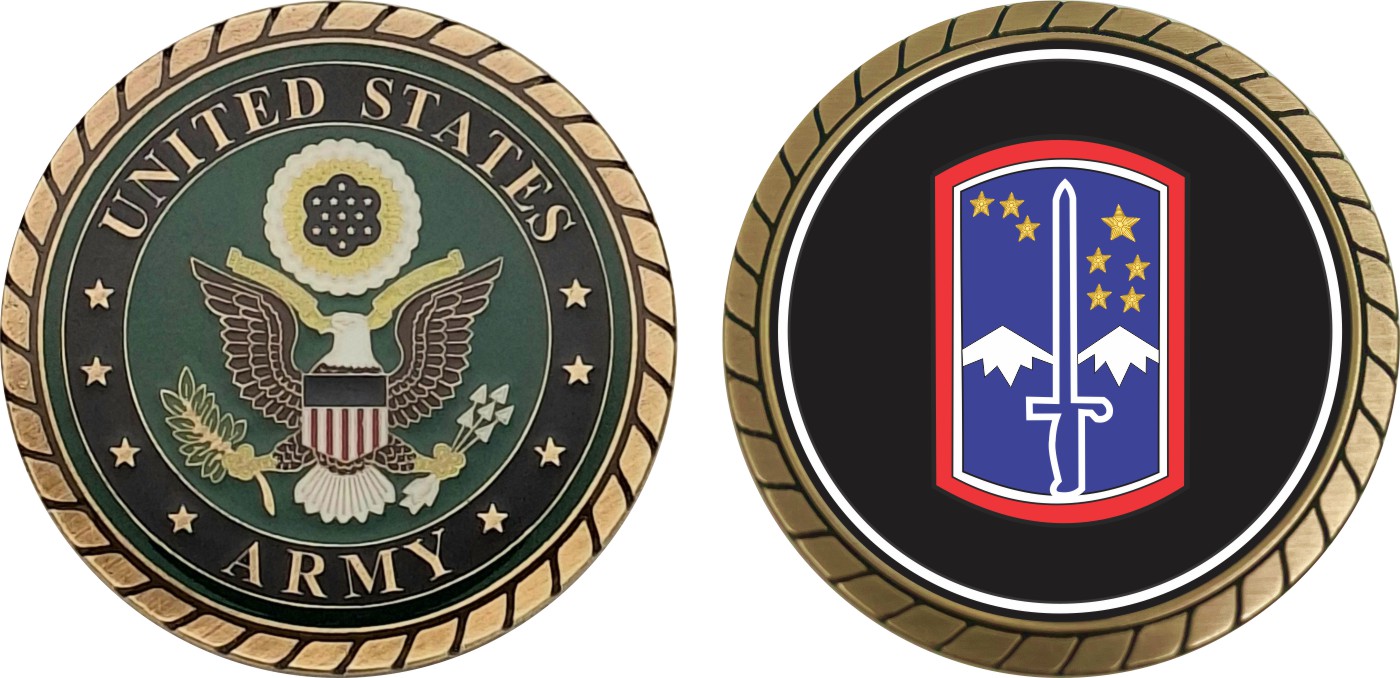 This 1 3/4” 172nd Brigade Challenge Coin is proudly offered by Militarybest. This Officially Licensed Army coin has beautiful enamel finish on one side and an organized crisp clean design on the opposite side.