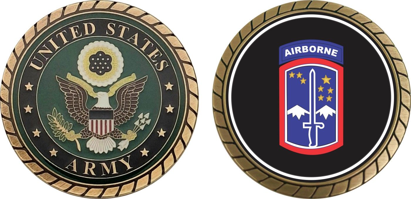 This 1 3/4” 172nd Infantry Brigade Airborne Challenge Coin is proudly offered by Militarybest. This Officially Licensed Army coin has beautiful enamel finish on one side and an organized crisp clean design on the opposite side.
