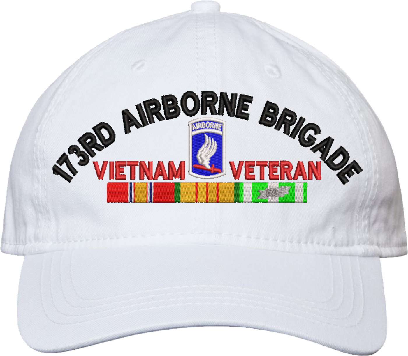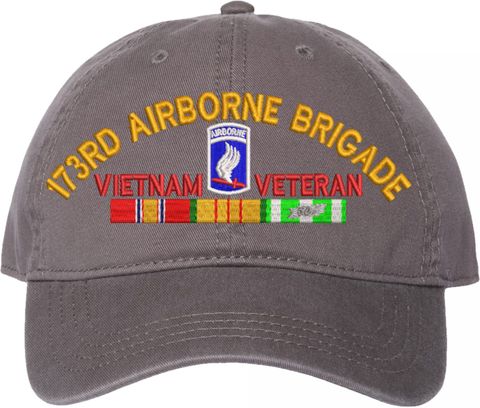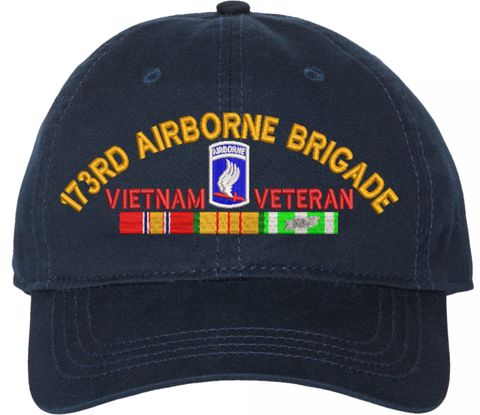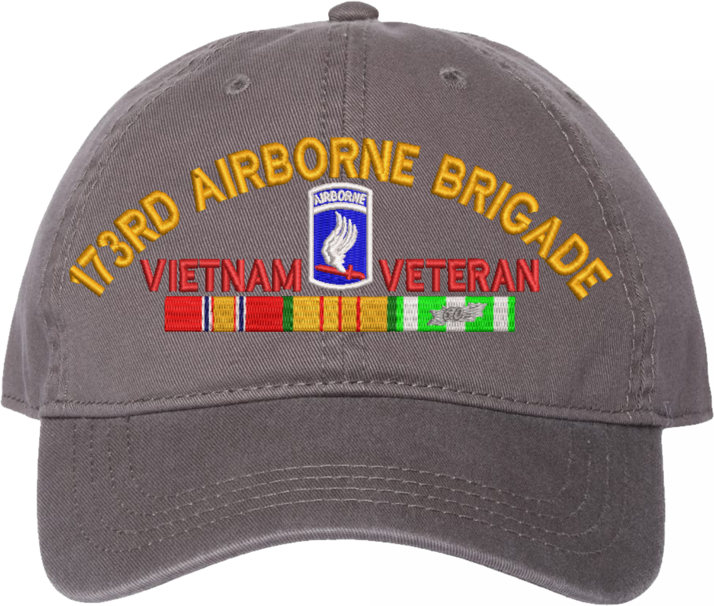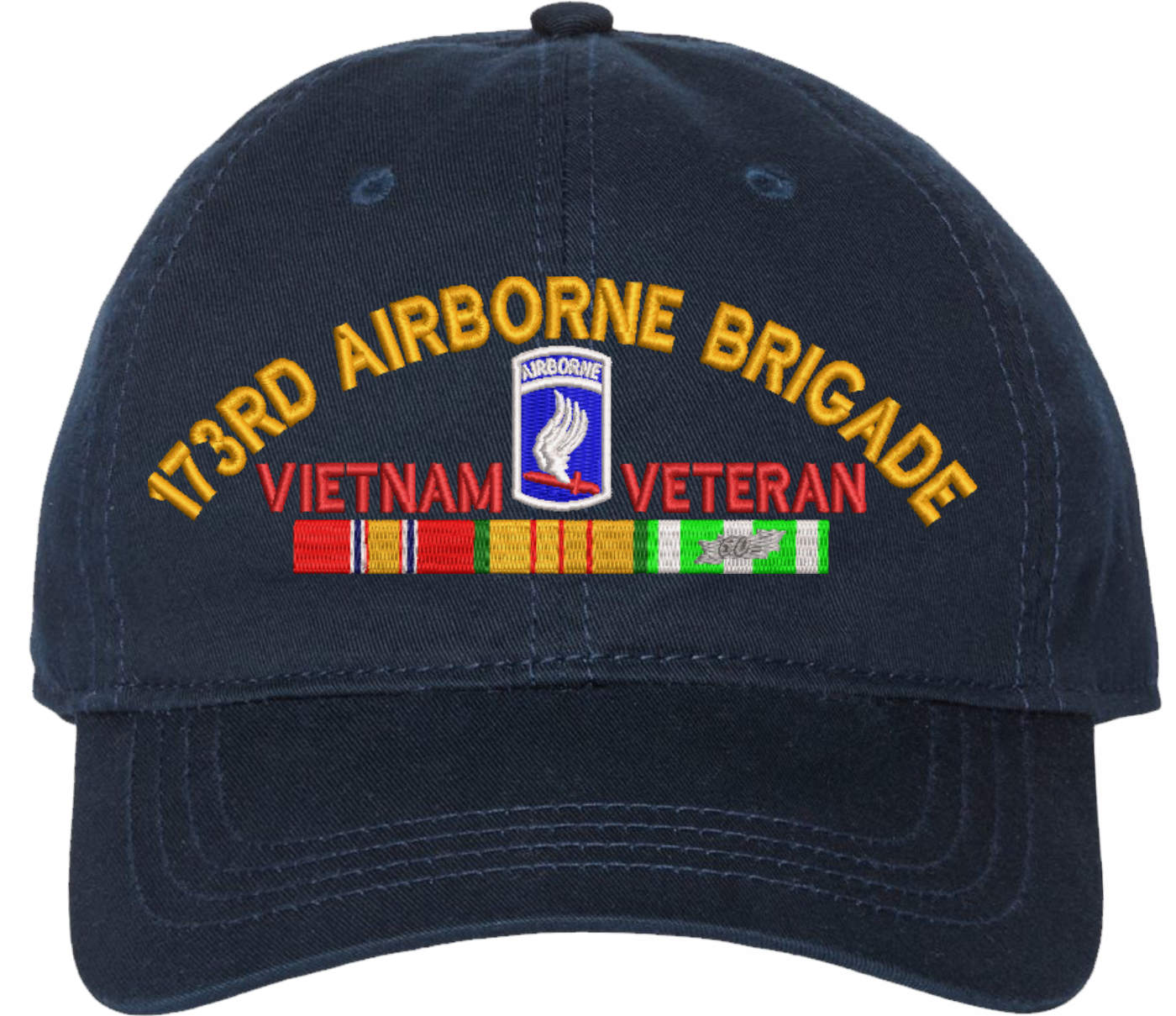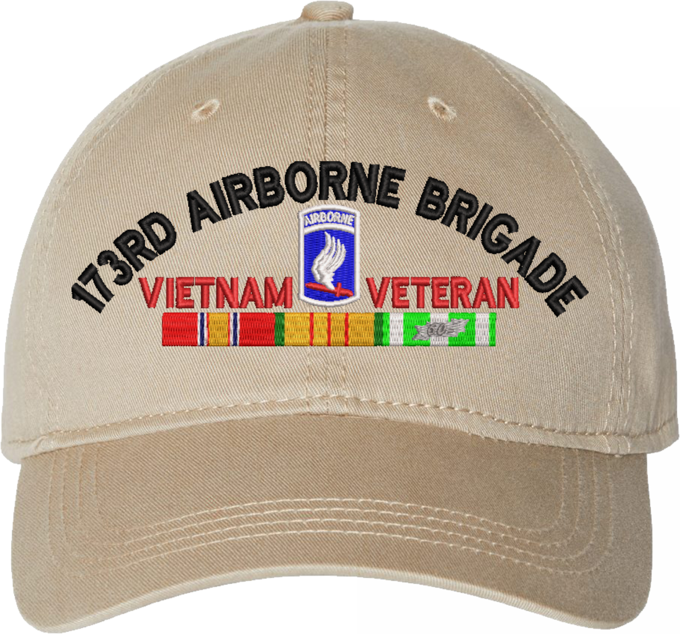 Show your Army pride with this 173rd Airborne Brigade Vietnam Veteran with Ribbons Unstructured Dad Cap from MilitaryBest. Crafted from 100% washed chino twill cotton, this six-panel, low-profile cap offers a relaxed and comfortable fit. Featuring high-quality embroidery done in our Scottsboro, Alabama facility, this cap is designed with a pre-curved visor and an adjustable tri-glide buckle closure for a perfect fit. Whether for everyday wear or as a meaningful gift, this cap is a great way to honor your own or a loved one's service.For caps ordered with custom embroidered personalized text please allow an additional 3 to 5 days production time. All custom back text will be embroidered in ALL CAPITAL LETTERS. Caps with back text or eggs are non-returnable unless there is a material defect in the cap.
