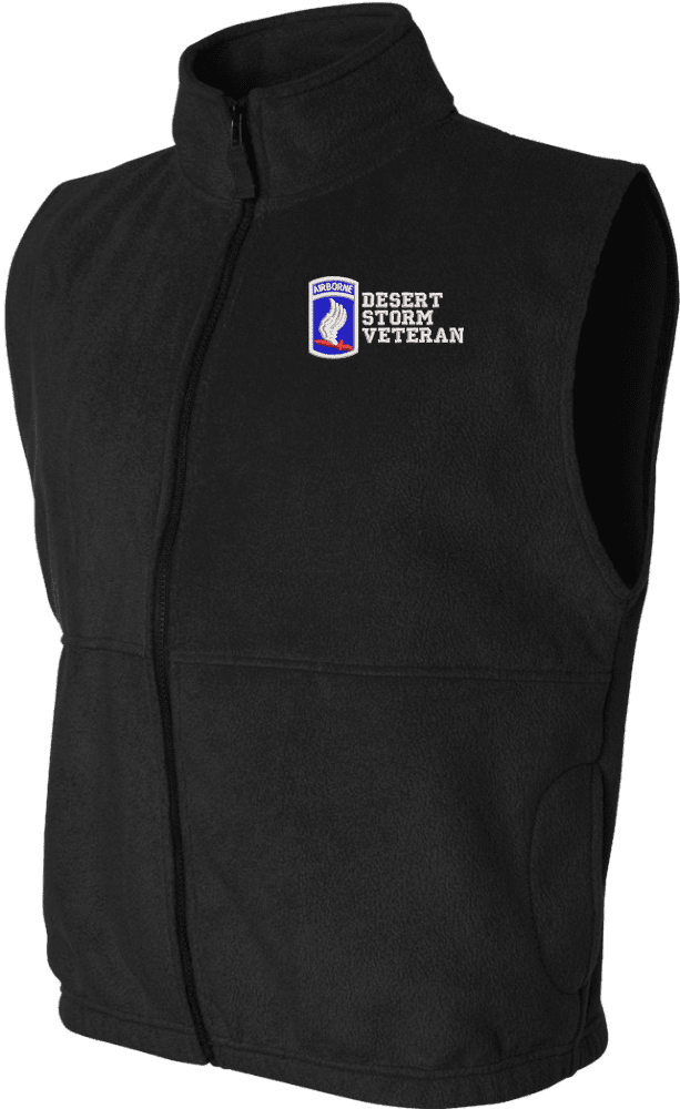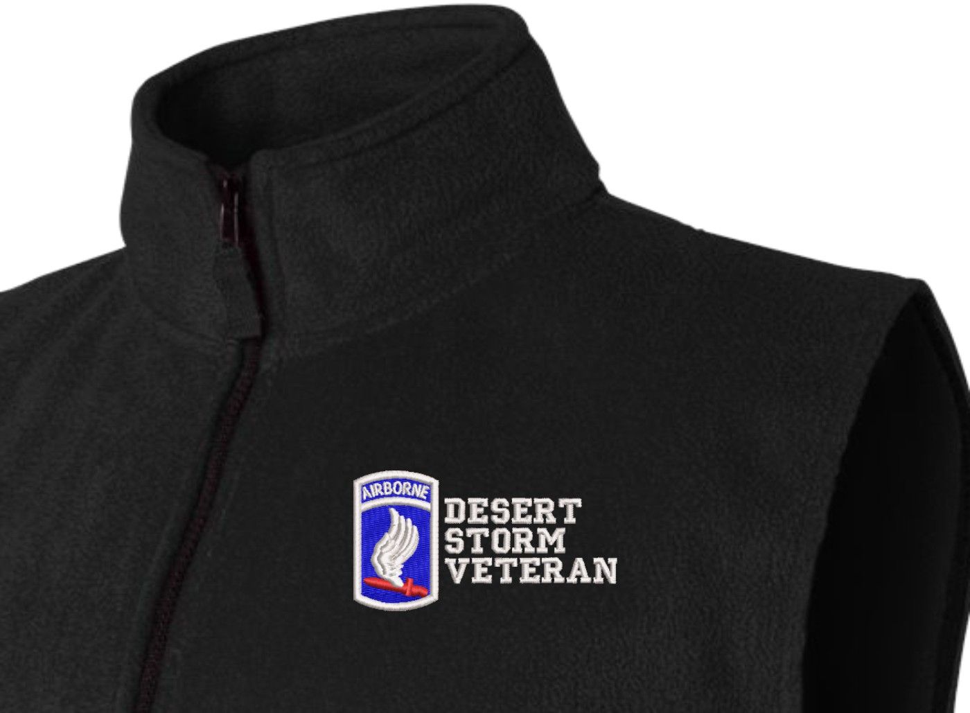 Due to supply chain disruptions, some colors and sizes may not be available in the same Brand, in these cases a brand of comparable quality will be used. Feel free to call in advance of your order, with questions you may have.MilitaryBest is proud to offer this quality 173rd Airborne Brigade Desert Storm Veteran Full-Zip Fleece Vest. Our U.S. Army Full Zip Fleece Vest features a convertible collar with dyed-to-match zipper pull and oversized nylon reinforced slash pockets. These Military Vests are proudly embroidered at our facilities in Scottsboro, AL.