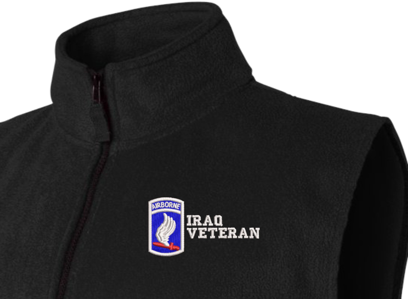 Due to supply chain disruptions, some colors and sizes may not be available in the same Brand, in these cases a brand of comparable quality will be used. Feel free to call in advance of your order, with questions you may have.MilitaryBest is proud to offer this quality 173rd Airborne Brigade Iraq Veteran Full-Zip Fleece Vest. Our U.S. Army Full Zip Fleece Vest features a convertible collar with dyed-to-match zipper pull and oversized nylon reinforced slash pockets. These Military Vests are proudly embroidered at our facilities in Scottsboro, AL.
