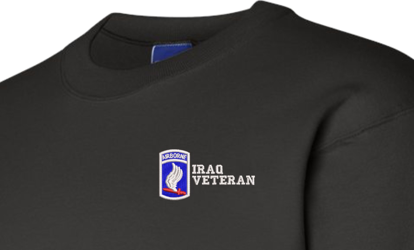 MilitaryBest is proud to offer this quality 173rd Airborne Brigade Iraq Veteran Sweatshirt. Each U.S. Army sweatshirt is direct embroidered onto either a Champion or Jerzees brand sweatshirt using a 9.5 oz 50/50 Cotton Poly blend material. These Military Sweatshirts are proudly embroidered at our facilities in Scottsboro, AL.