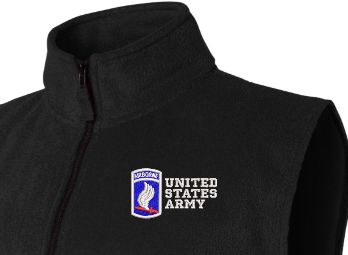 Due to supply chain disruptions, some colors and sizes may not be available in the same Brand, in these cases a brand of comparable quality will be used. Feel free to call in advance of your order, with questions you may have.MilitaryBest is proud to offer this quality 173rd Airborne Brigade United States Army Full-Zip Fleece Vest. Our U.S. Army Full Zip Fleece Vest features a convertible collar with dyed-to-match zipper pull and oversized nylon reinforced slash pockets. These Military Vests are proudly embroidered at our facilities in Scottsboro, AL.