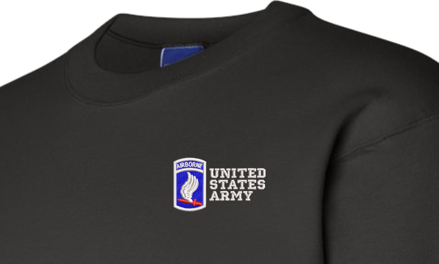MilitaryBest is proud to offer this quality 173rd Airborne Brigade United States Army Sweatshirt. Each U.S. Army sweatshirt is direct embroidered onto either a Champion or Jerzees brand sweatshirt using a 9.5 oz 50/50 Cotton Poly blend material. These Military Sweatshirts are proudly embroidered at our facilities in Scottsboro, AL.