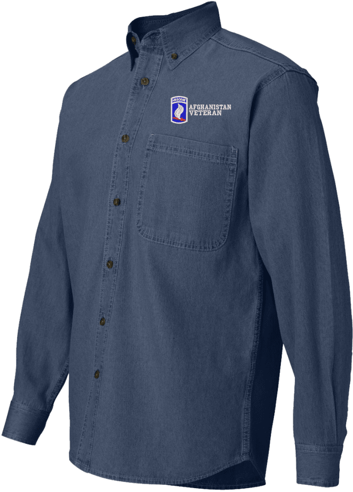 Note: Some of the Color Options pictured may not be available. Available Color Options are listed on the drop down menu above.MilitaryBest is proud to offer this quality 173rd Airborne Brigade Afghanistan Veteran Denim Shirt. This long sleeve button down denim shirt is made using a 100% cotton denim material. These quality Military Denim Shirts are proudly embroidered at our facilities in Scottsboro, AL. Support the Army MWR program by purchasing only from Licensed Vendors.