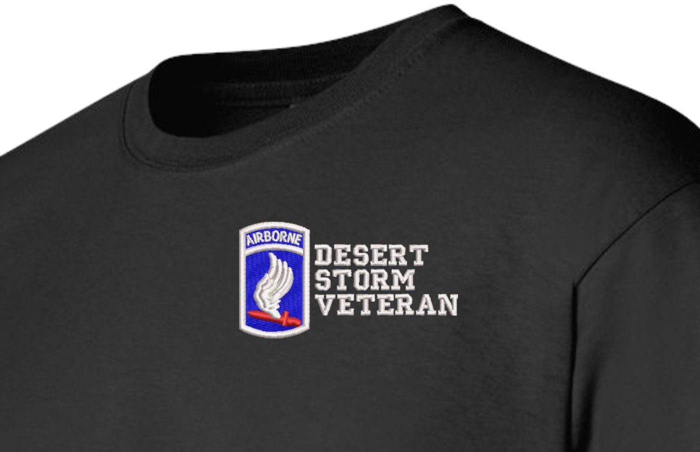 Note: Some of the Color Options pictured may not be available. Available Color Options are listed on the drop down menu above.MilitaryBest is proud to offer this quality 173rd Airborne Brigade Desert Storm Veteran T Shirt. This Gildan brand short sleeve t-shirt is made using a 6 oz pre-shrunk 100% cotton material. These quality Military T Shirts are proudly embroidered at our facilities in Scottsboro, AL. Support the Army MWR program by purchasing only from Licensed Vendors.