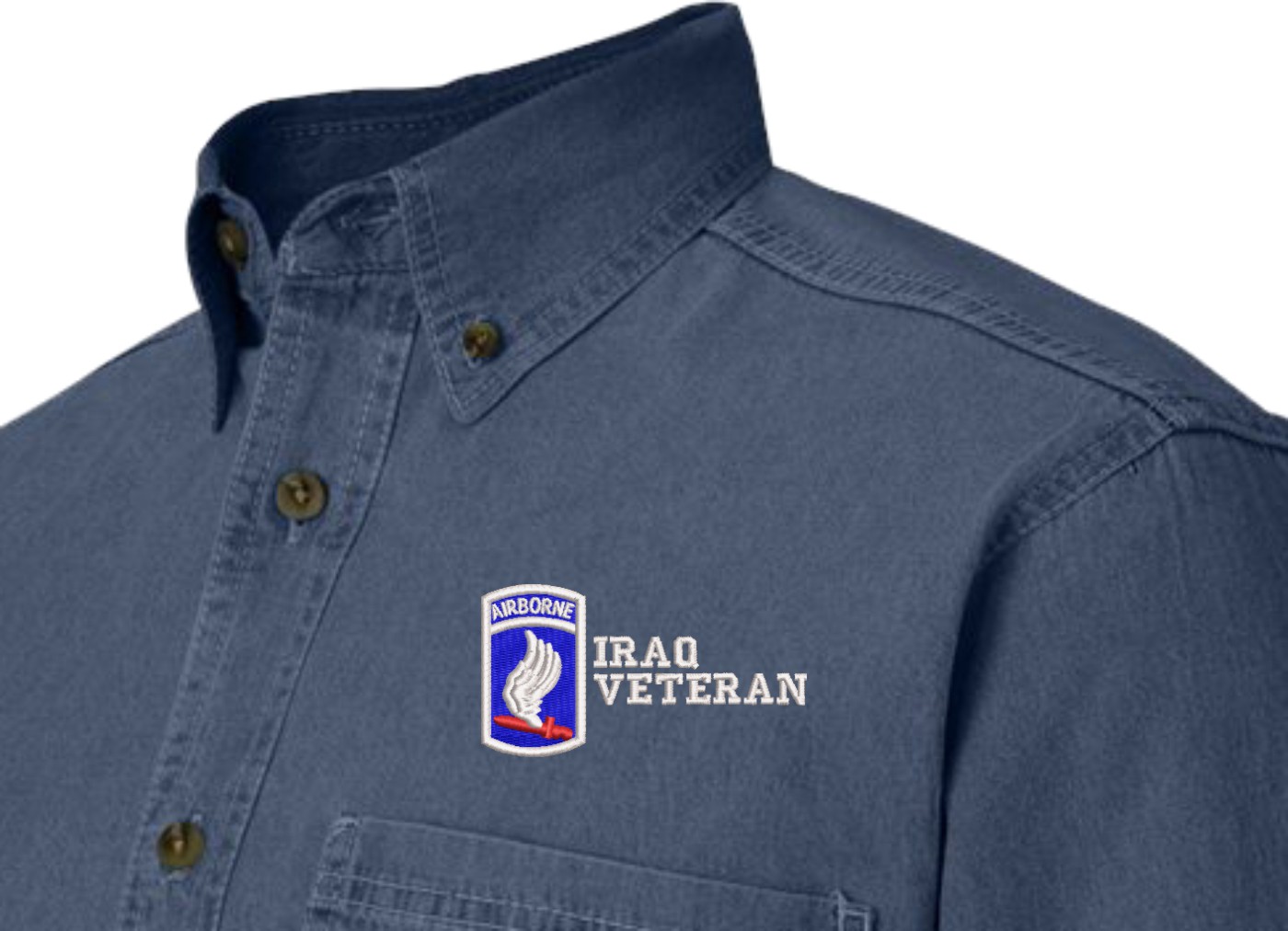 Note: Some of the Color Options pictured may not be available. Available Color Options are listed on the drop down menu above.MilitaryBest is proud to offer this quality 173rd Airborne Brigade Iraq Veteran Denim Shirt. This long sleeve button down denim shirt is made using a 100% cotton denim material. These quality Military Denim Shirts are proudly embroidered at our facilities in Scottsboro, AL. Support the Army MWR program by purchasing only from Licensed Vendors.
