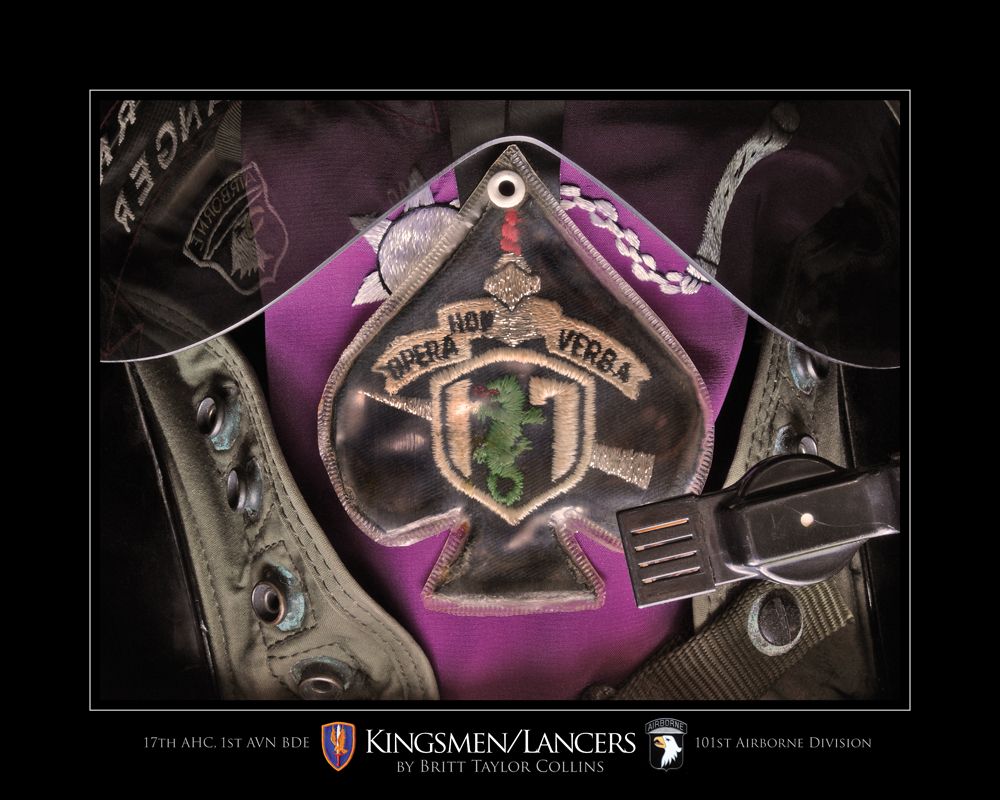 TO FULLY APPRECIATE THE DETAIL IN THIS PIECE, PLEASE CLICK ON THE IMAGE ABOVE TO ENLARGE.We are extremely proud and honored to have partnered with Britt Taylor Collins, “The Veterans’ Artist”, to offer an extensive line of Military Art, particularly these incredible Giclee LenzPrints. This 17th AHC 1st AVN BDE Kingsmen/Lancers VIC fine Military Art Piece is printed with Archival Fade Resistant inks on high quality Museum Grade paper. Each Military art piece is printed one at a time and inspected by the artist, Britt Taylor Collins. After inspection this piece is signed by Britt himself.