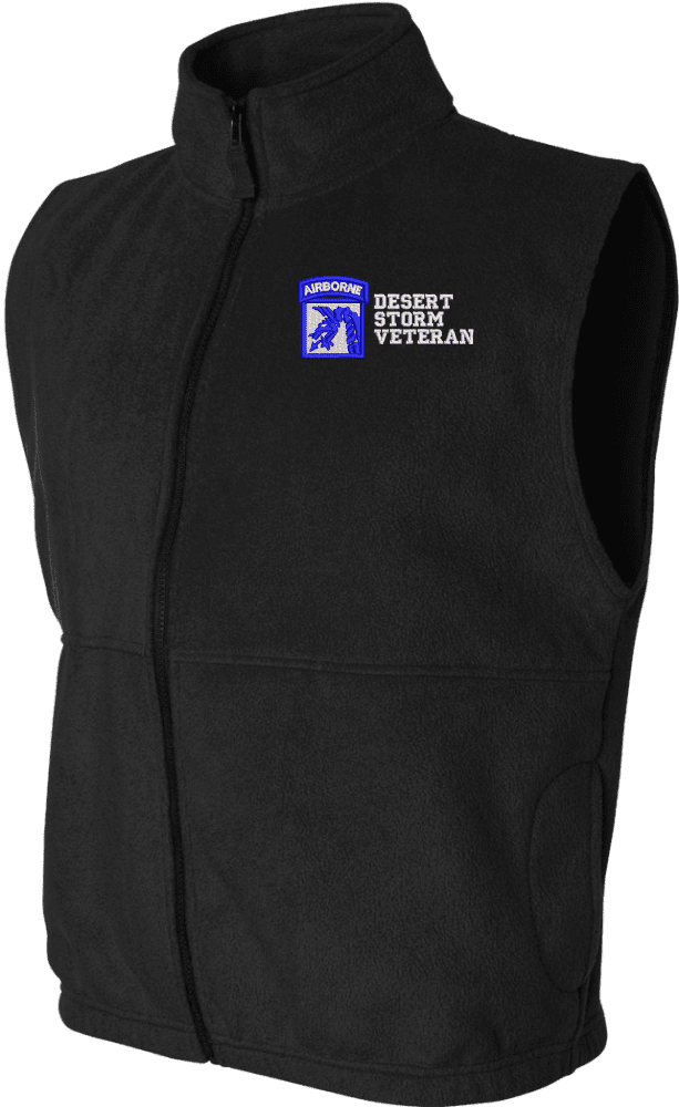 Due to supply chain disruptions, some colors and sizes may not be available in the same Brand, in these cases a brand of comparable quality will be used. Feel free to call in advance of your order, with questions you may have.MilitaryBest is proud to offer this quality 18th Airborne Corps Desert Storm Veteran Full-Zip Fleece Vest. Our U.S. Army Full Zip Fleece Vest features a convertible collar with dyed-to-match zipper pull and oversized nylon reinforced slash pockets. These Military Vests are proudly embroidered at our facilities in Scottsboro, AL.
