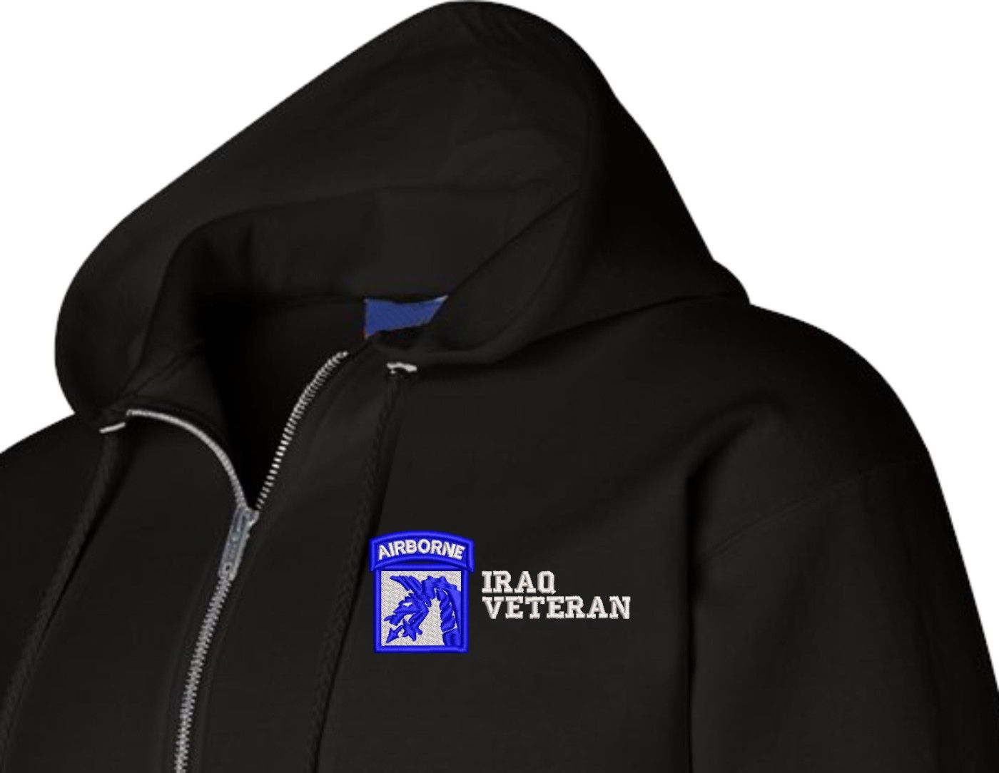 MilitaryBest is proud to offer this quality 18th Airborne Corps Iraq Veteran Zippered Hoodie. Each U.S. Army Zippered Hoodie is direct embroidered onto either a Champion or Gildan brand Zippered Hoodie using a 9.5 oz 50/50 Cotton Poly blend material. These Military Zippered Hoodies are proudly embroidered at our facilities in Scottsboro, AL.