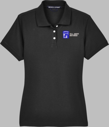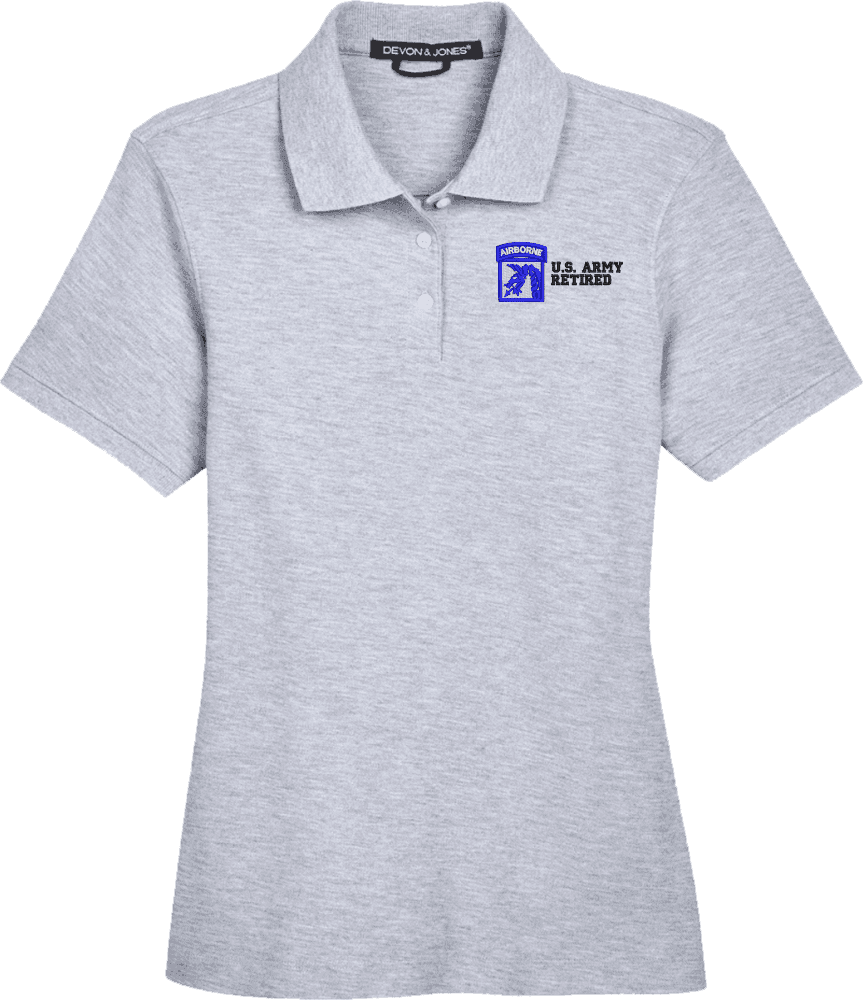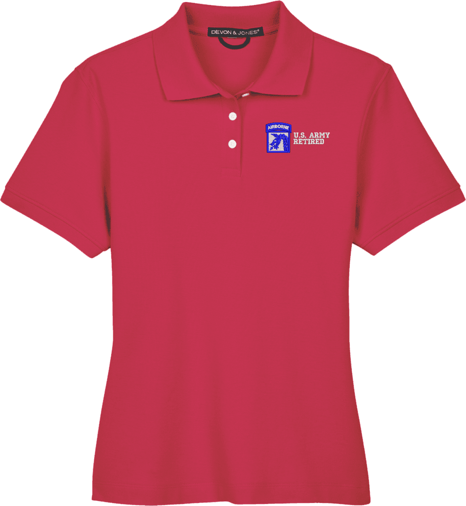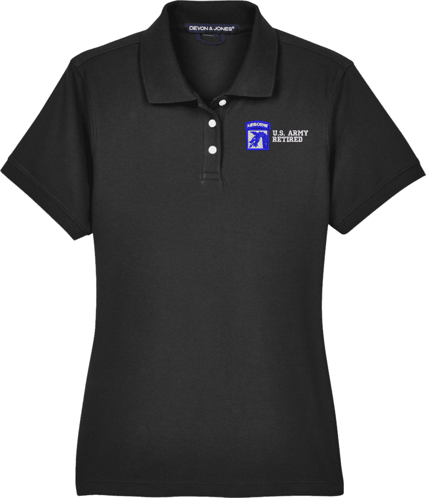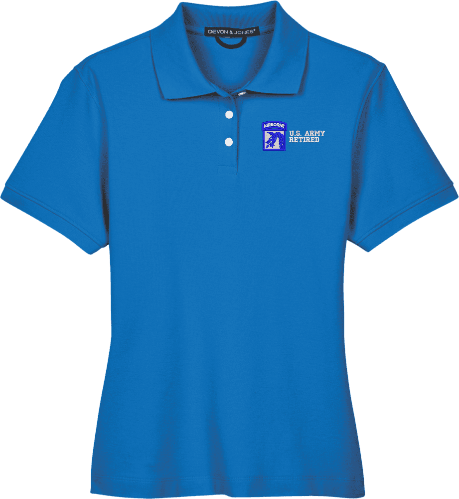 Note: Some of the Color Options pictured may not be available. Available Color Options are listed on the drop down menu above.MilitaryBest is proud to offer this 18th Airborne Corps Retired Women's Devon & Jones Polo. This Ladies Polo features Rib knit cuffs, Dura-Pearl Buttons, and a Three-Button Placket. These Polos are made with 6.8 oz., 100% Peruvian Pima Cotton and are proudly embroidered at our facilities in Scottsboro, AL.