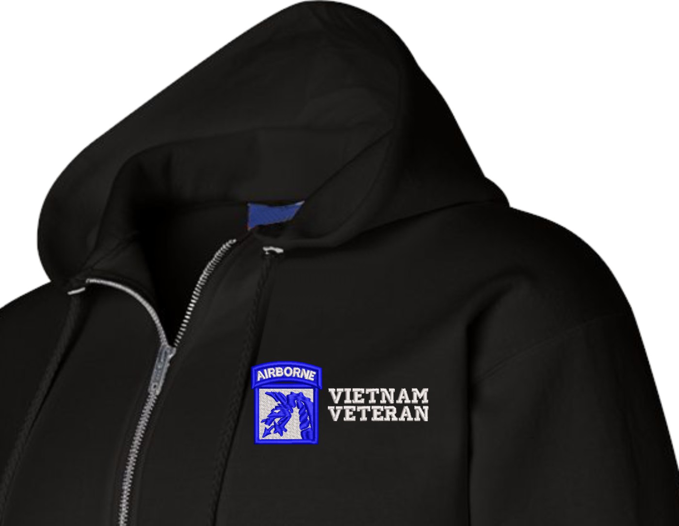 MilitaryBest is proud to offer this quality 18th Airborne Corps Vietnam Veteran Zippered Hoodie. Each U.S. Army Zippered Hoodie is direct embroidered onto either a Champion or Gildan brand Zippered Hoodie using a 9.5 oz 50/50 Cotton Poly blend material. These Military Zippered Hoodies are proudly embroidered at our facilities in Scottsboro, AL.