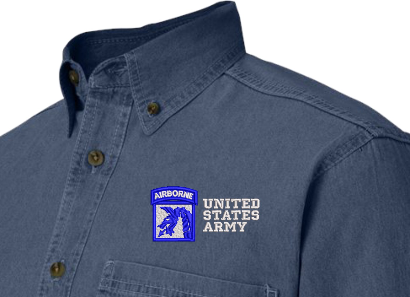 Note: Some of the Color Options pictured may not be available. Available Color Options are listed on the drop down menu above.MilitaryBest is proud to offer this quality 18th Airborne Corps United States Army Denim Shirt. This long sleeve button down denim shirt is made using a 100% cotton denim material. These quality Military Denim Shirts are proudly embroidered at our facilities in Scottsboro, AL. Support the Army MWR program by purchasing only from Licensed Vendors.