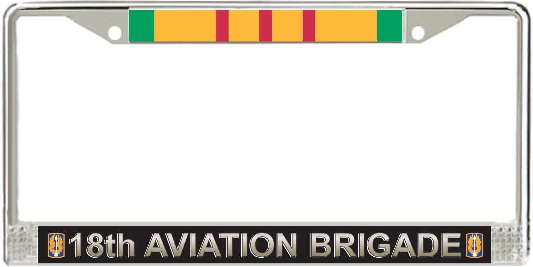 18th Aviation Brigade Vietnam Veteran License Plate FrameThis U.S. Army 18th Aviation Brigade Vietnam Veteran License Plate Frame is made from the highest quality finished metal alloy. Each one is designed to provide years of use. Each is designed and produced in our facility in Scottsboro, Alabama.