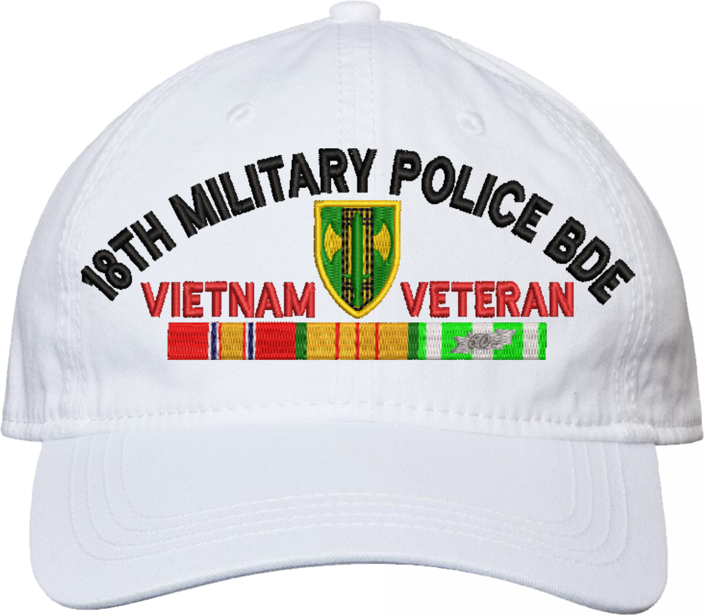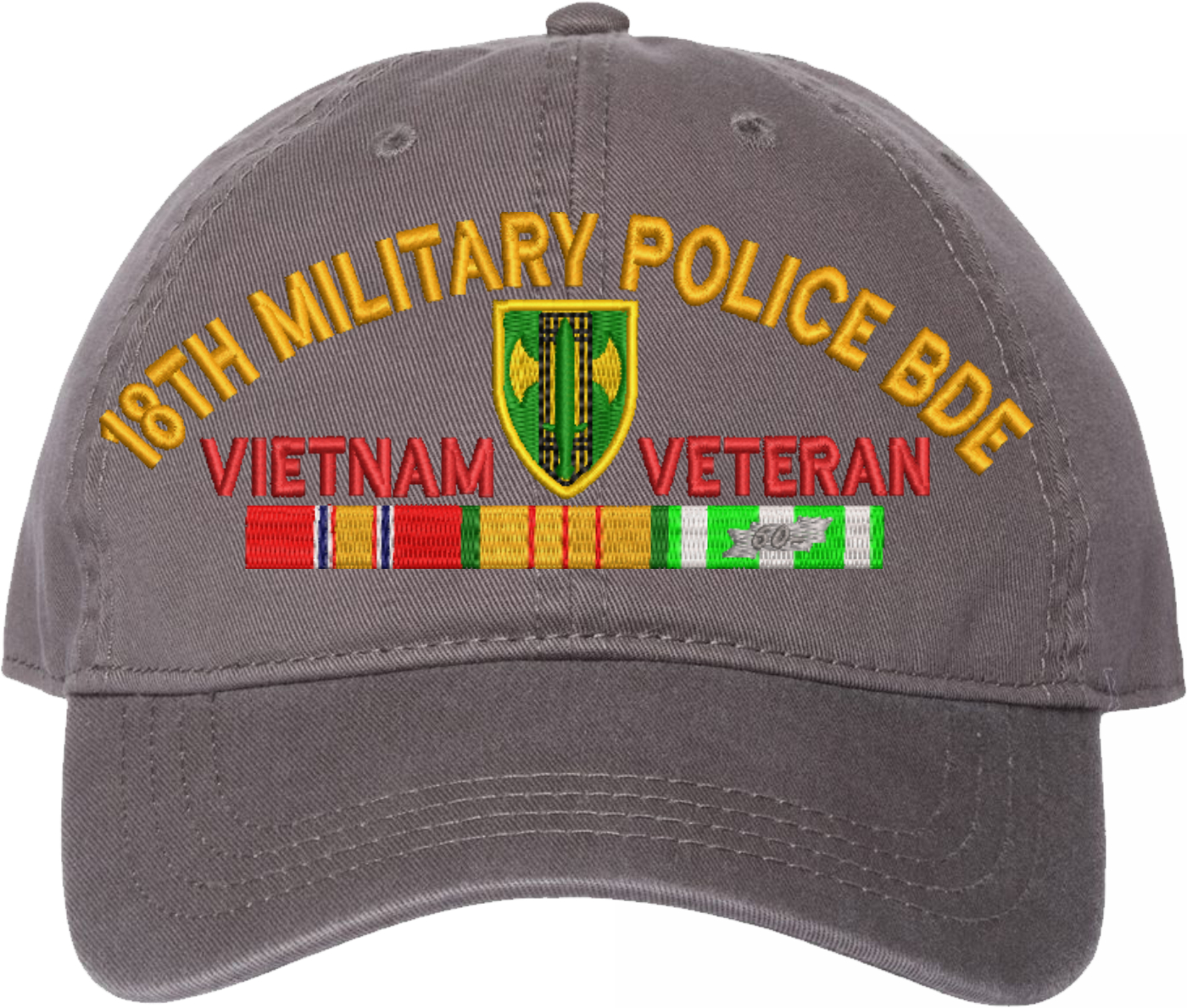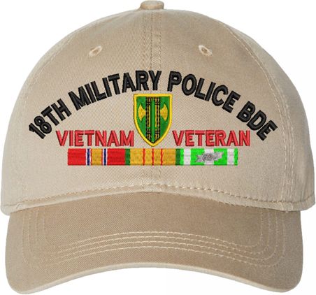 Show your Army pride with this 18th Military Police Brigade Vietnam Veteran with Ribbons Unstructured Dad Cap from MilitaryBest. Crafted from 100% washed chino twill cotton, this six-panel, low-profile cap offers a relaxed and comfortable fit. Featuring high-quality embroidery done in our Scottsboro, Alabama facility, this cap is designed with a pre-curved visor and an adjustable tri-glide buckle closure for a perfect fit. Whether for everyday wear or as a meaningful gift, this cap is a great way to honor your own or a loved one's service.For caps ordered with custom embroidered personalized text please allow an additional 3 to 5 days production time. All custom back text will be embroidered in ALL CAPITAL LETTERS. Caps with back text or eggs are non-returnable unless there is a material defect in the cap.