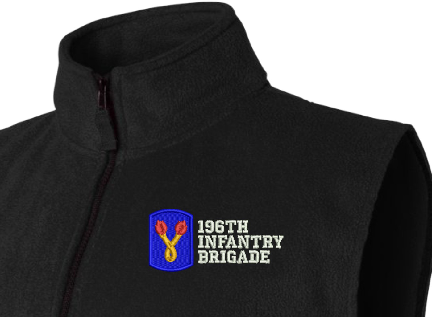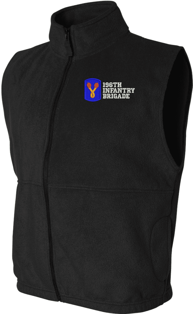 Due to supply chain disruptions, some colors and sizes may not be available in the same Brand, in these cases a brand of comparable quality will be used. Feel free to call in advance of your order, with questions you may have.MilitaryBest is proud to offer this quality 196th Infantry Brigade Full-Zip Fleece Vest. Our U.S. Army Vests features a convertible collar with dyed-to-match zipper pull and oversized nylon reinforced slash pockets. These Military Vests are proudly embroidered at our facilities in Scottsboro, AL.