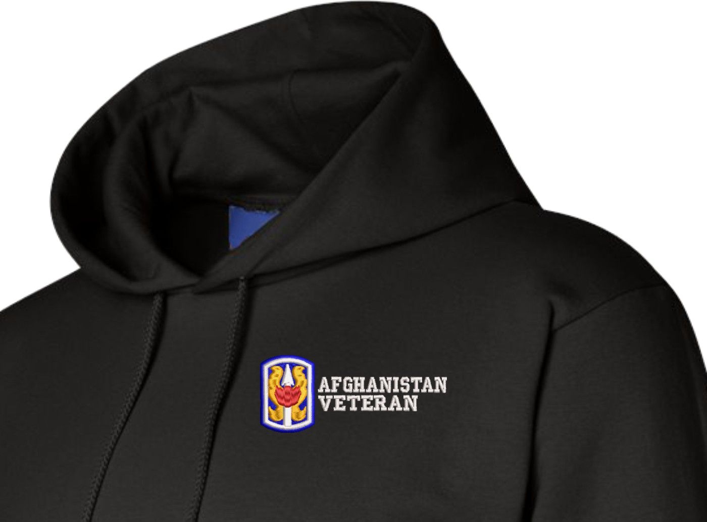 MilitaryBest is proud to offer this quality 199th Infantry Brigade Afghanistan Veteran Hoodie. Each U.S. Army Hoodie is direct embroidered onto either a Champion or Gildan brand Hoodie using a 9.5 oz 50/50 Cotton Poly blend material. These Military Hoodies are proudly embroidered at our facilities in Scottsboro, AL.