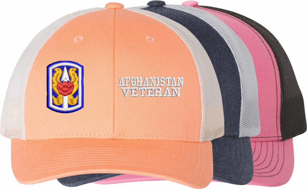 MilitaryBest is proud to offer this Mesh Back U.S. Army 199th Infantry Brigade Afghanistan Veteran Women's Split-Cap. The design is embroidered onto a 6x panel mid/low profile mesh back cap and is crisp, clean, and sure to be loved by all! As with all MilitaryBest caps and apparel your satisfaction is guaranteed!Caps ordered with embroidered back text requires an additional 1 to 2 days of production time. All personalized caps will be embroidered in ALL CAPITAL LETTERS. Caps personalized with back text are not returnable unless there is a material defect in the cap.