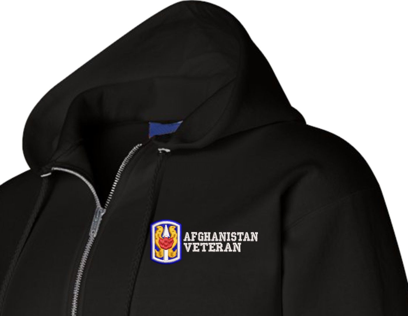 MilitaryBest is proud to offer this quality 199th Infantry Brigade Afghanistan Veteran Zippered Hoodie. Each U.S. Army Zippered Hoodie is direct embroidered onto either a Champion or Gildan brand Zippered Hoodie using a 9.5 oz 50/50 Cotton Poly blend material. These Military Zippered Hoodies are proudly embroidered at our facilities in Scottsboro, AL.