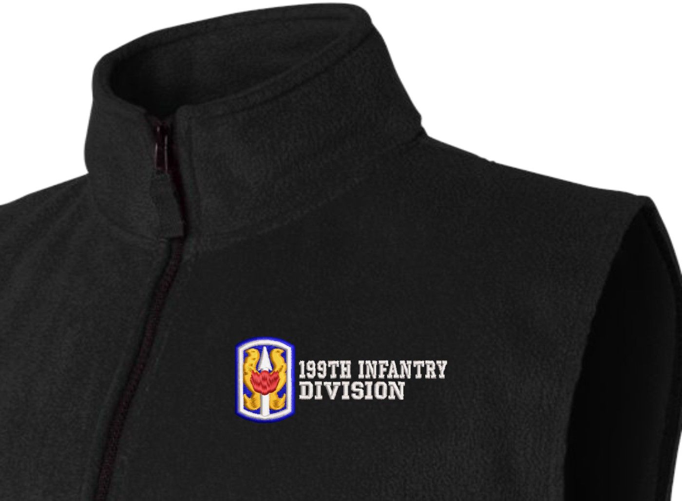 Due to supply chain disruptions, some colors and sizes may not be available in the same Brand, in these cases a brand of comparable quality will be used. Feel free to call in advance of your order, with questions you may have.MilitaryBest is proud to offer this quality 199th Infantry Brigade Full-Zip Fleece Vest. Our U.S. Army Vests features a convertible collar with dyed-to-match zipper pull and oversized nylon reinforced slash pockets. These Military Vests are proudly embroidered at our facilities in Scottsboro, AL.