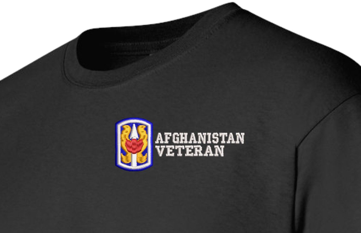 Note: Some of the Color Options pictured may not be available. Available Color Options are listed on the drop down menu above.MilitaryBest is proud to offer this quality 199th Infantry Brigade Afghanistan Veteran T Shirt. This Gildan brand short sleeve t-shirt is made using a 6 oz pre-shrunk 100% cotton material. These quality Military T Shirts are proudly embroidered at our facilities in Scottsboro, AL. Support the Army MWR program by purchasing only from Licensed Vendors.