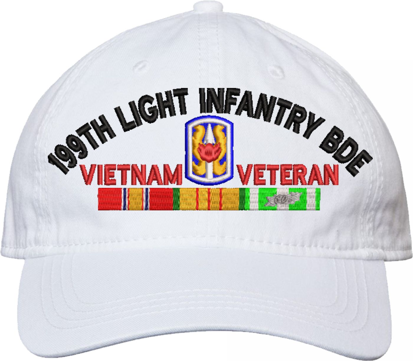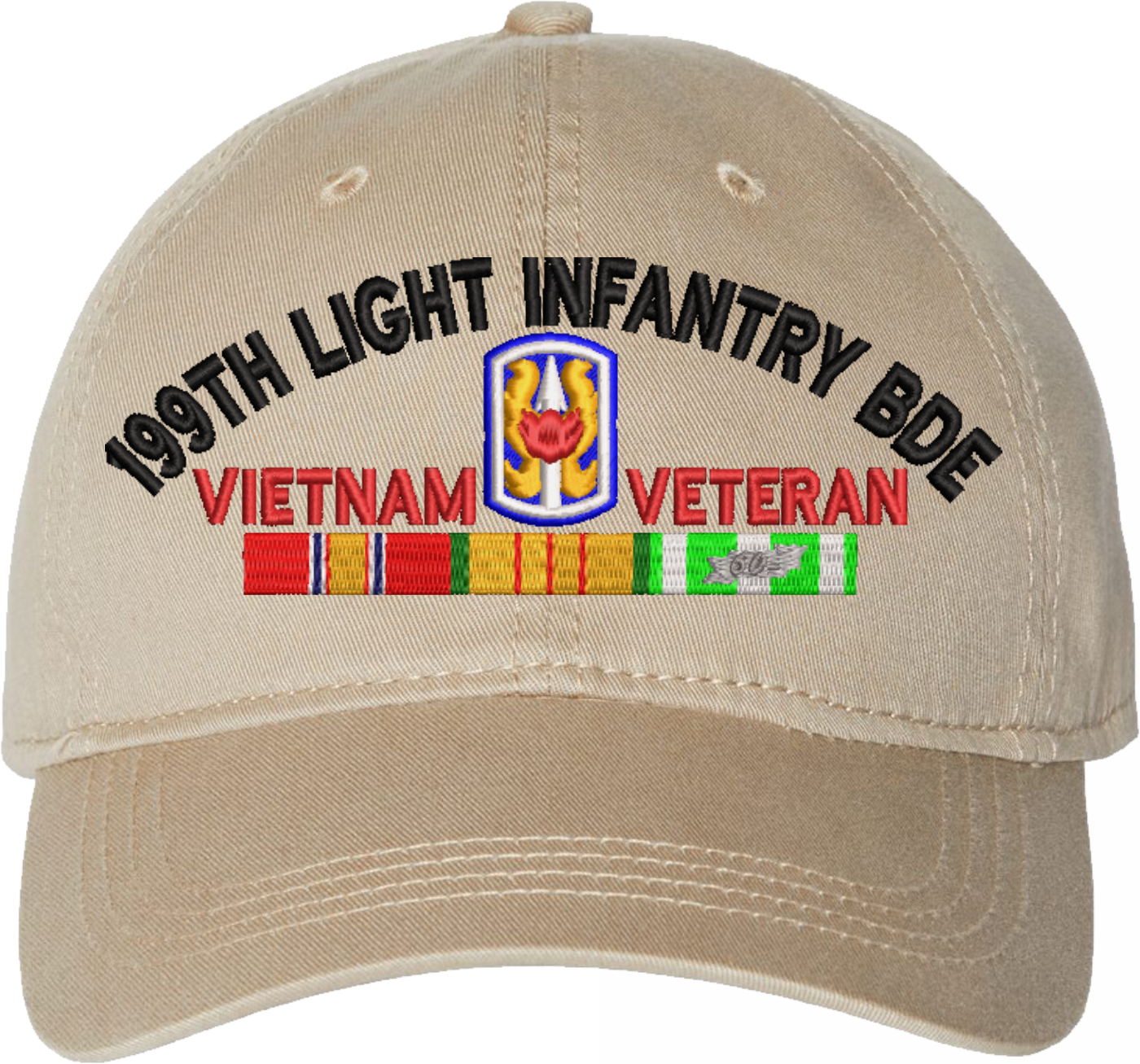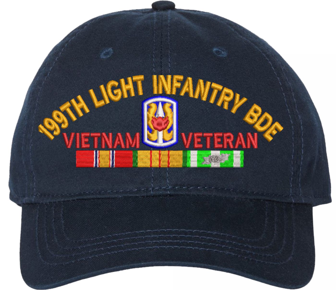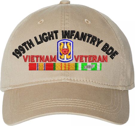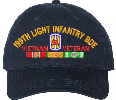 Show your Army pride with this 199th Light Infantry Brigade Vietnam Veteran with Ribbons Unstructured Dad Cap from MilitaryBest. Crafted from 100% washed chino twill cotton, this six-panel, low-profile cap offers a relaxed and comfortable fit. Featuring high-quality embroidery done in our Scottsboro, Alabama facility, this cap is designed with a pre-curved visor and an adjustable tri-glide buckle closure for a perfect fit. Whether for everyday wear or as a meaningful gift, this cap is a great way to honor your own or a loved one's service.For caps ordered with custom embroidered personalized text please allow an additional 3 to 5 days production time. All custom back text will be embroidered in ALL CAPITAL LETTERS. Caps with back text or eggs are non-returnable unless there is a material defect in the cap.