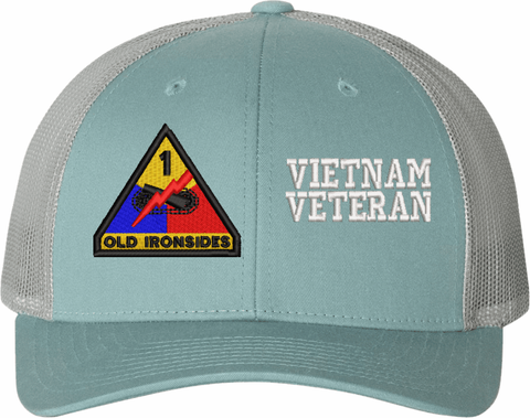 MilitaryBest is proud to offer this Mesh Back U.S. Army 1st Armored Division Vietnam Veteran Women's Split-Cap. The design is embroidered onto a 6x panel mid/low profile mesh back cap and is crisp, clean, and sure to be loved by all! As with all MilitaryBest caps and apparel your satisfaction is guaranteed!Caps ordered with embroidered back text requires an additional 1 to 2 days of production time. All personalized caps will be embroidered in ALL CAPITAL LETTERS. Caps personalized with back text are not returnable unless there is a material defect in the cap.