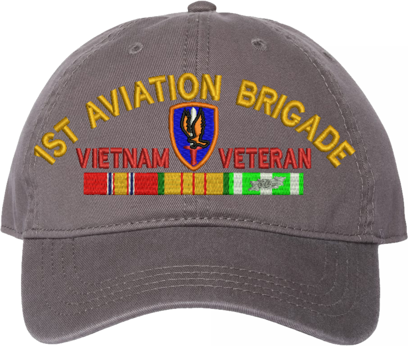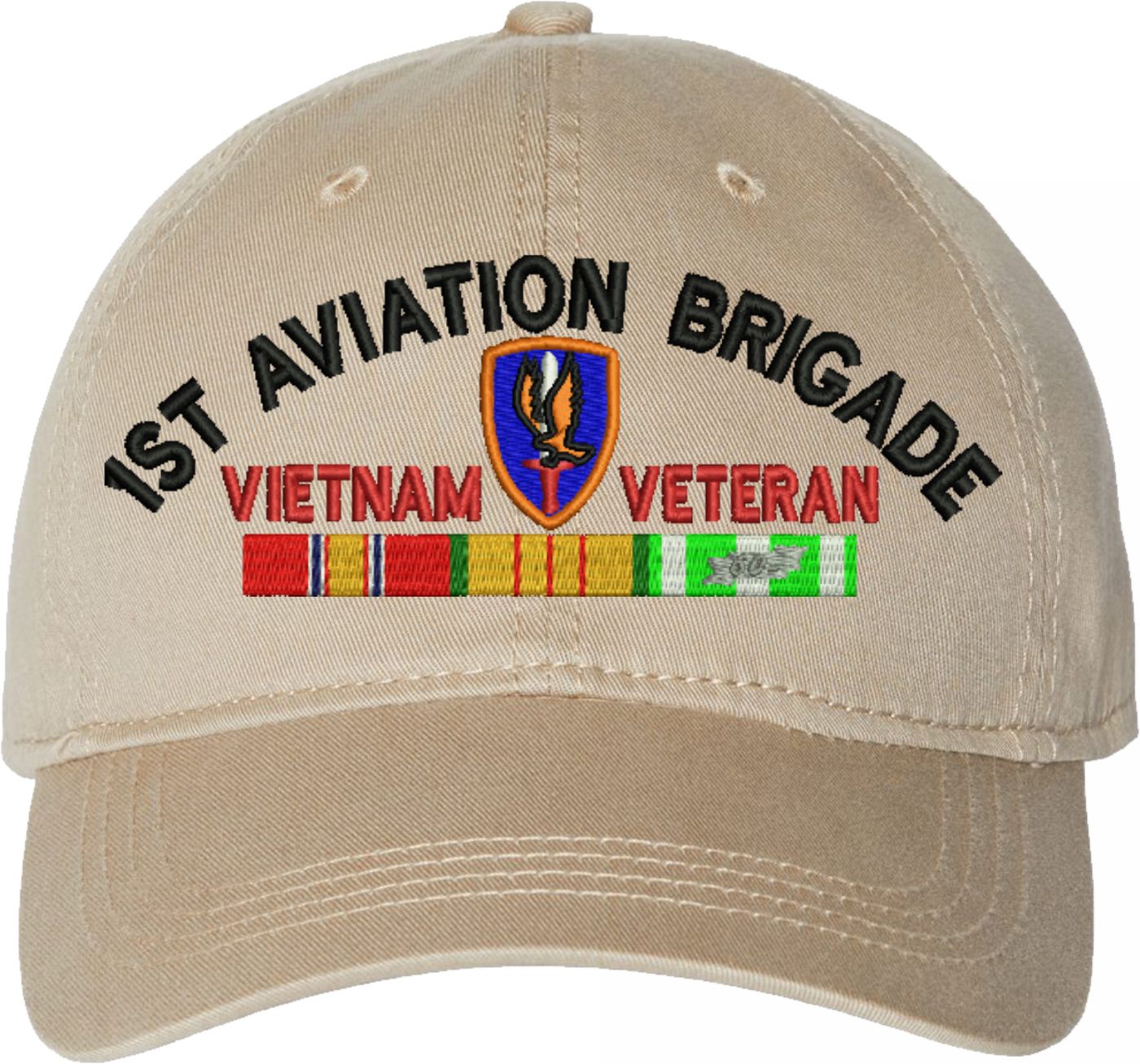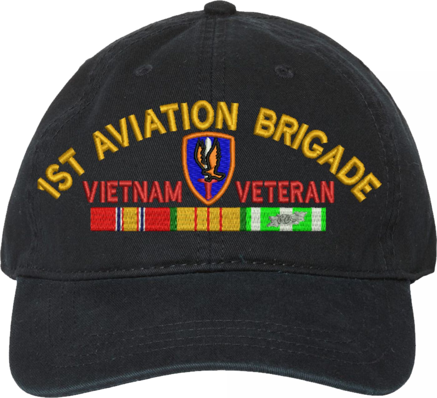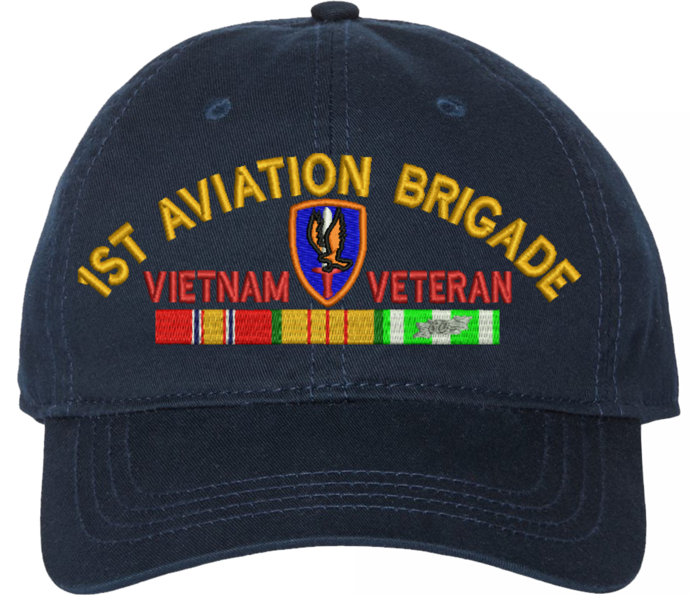 Show your Army pride with this 1st Aviation Brigade Vietnam Veteran with Ribbons Unstructured Dad Cap from MilitaryBest. Crafted from 100% washed chino twill cotton, this six-panel, low-profile cap offers a relaxed and comfortable fit. Featuring high-quality embroidery done in our Scottsboro, Alabama facility, this cap is designed with a pre-curved visor and an adjustable tri-glide buckle closure for a perfect fit. Whether for everyday wear or as a meaningful gift, this cap is a great way to honor your own or a loved one's service.For caps ordered with custom embroidered personalized text please allow an additional 3 to 5 days production time. All custom back text will be embroidered in ALL CAPITAL LETTERS. Caps with back text or eggs are non-returnable unless there is a material defect in the cap.