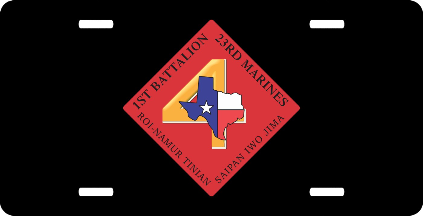 This 1st Battalion 23rd Marines License Plate is made from heavy gauge aluminum and has a baked enamel finish to last for many years of use. Each plate measures 5 15/16" x 11 15/16". This license plate would make a wonderful addition to your collection or a great gift.