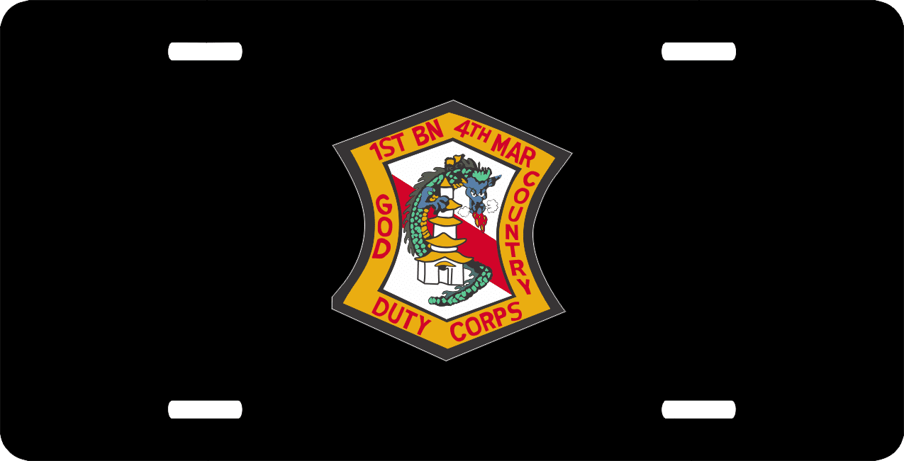 This 1st Battalion 4th Marines License Plate is made from heavy gauge aluminum and has a baked enamel finish to last for many years of use. Each plate measures 5 15/16" x 11 15/16". This license plate would make a wonderful addition to your collection or a great gift.