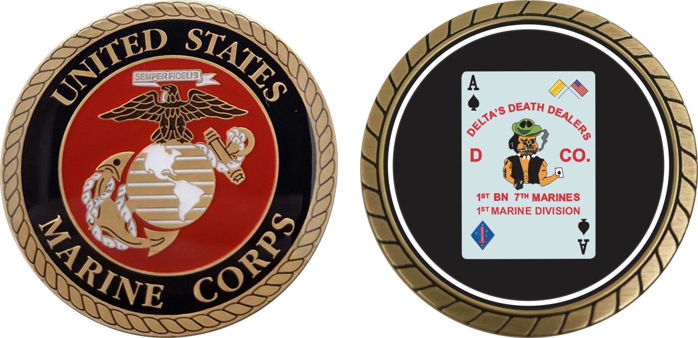 This 1 3/4” 1st Battalion 7th Marines 1st Marine Division Challenge Coin is proudly offered by Militarybest. This Officially Licensed Marine Corps coin has beautiful enamel finish on one side and an organized crisp clean design on the opposite side.