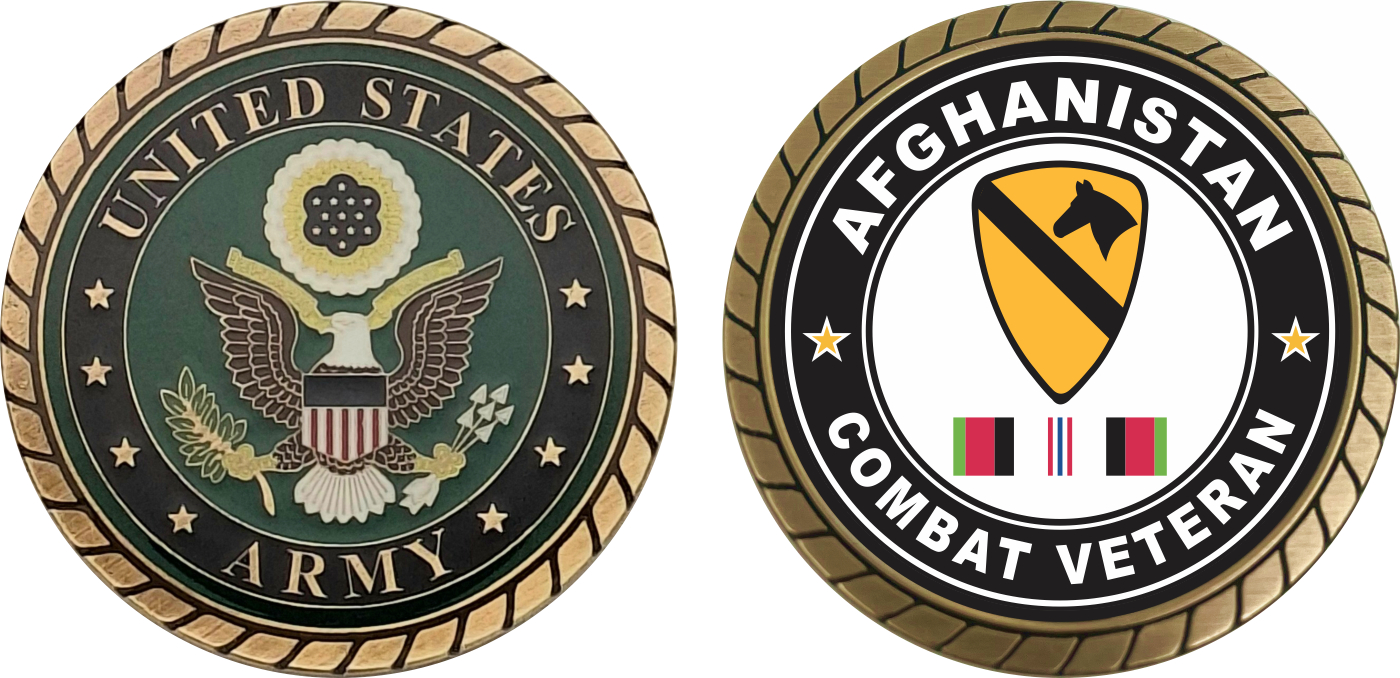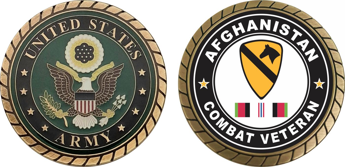This 1 3/4” 1st Cavalry Division Afghanistan Combat Veteran Challenge Coin is proudly offered by MilitaryBest. This Officially Licensed Army coin has beautiful enamel finish on one side and an organized crisp clean 1st Cavalry Division Afghanistan Combat Veteran design on the opposite side.