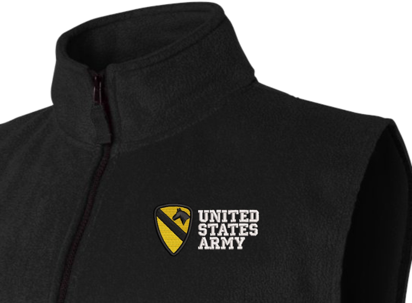 Due to supply chain disruptions, some colors and sizes may not be available in the same Brand, in these cases a brand of comparable quality will be used. Feel free to call in advance of your order, with questions you may have.MilitaryBest is proud to offer this quality 1st Cavalry Division United States Army Full-Zip Fleece Vest. Our U.S. Army Full Zip Fleece Vest features a convertible collar with dyed-to-match zipper pull and oversized nylon reinforced slash pockets. These Military Vests are proudly embroidered at our facilities in Scottsboro, AL.