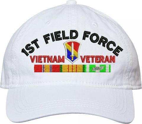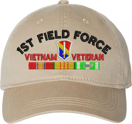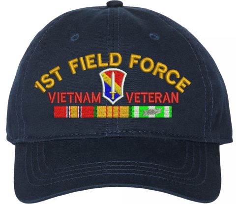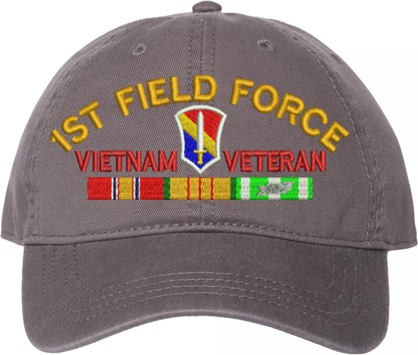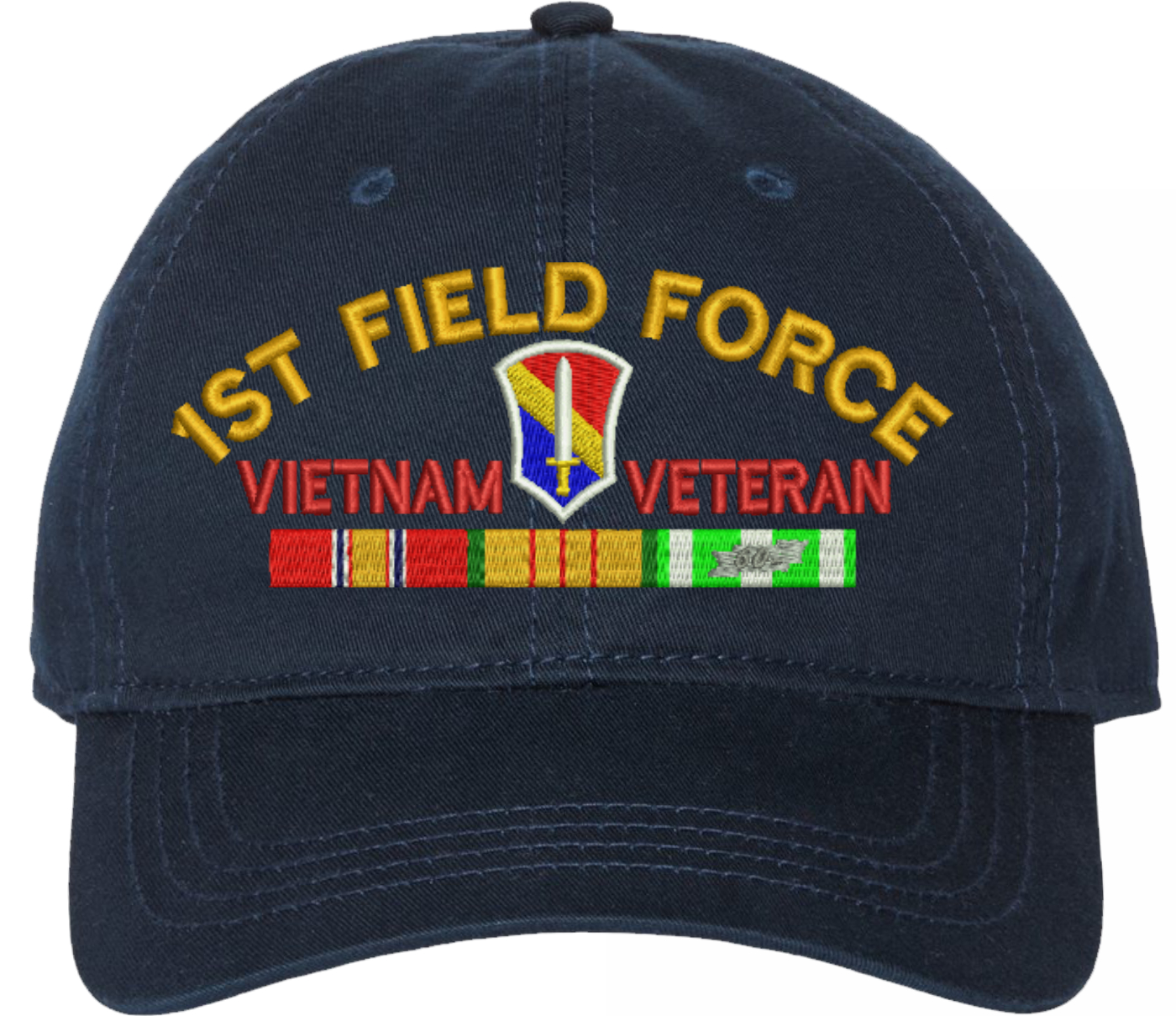 Show your Army pride with this 1st Field Force Vietnam Veteran with Ribbons Unstructured Dad Cap from MilitaryBest. Crafted from 100% washed chino twill cotton, this six-panel, low-profile cap offers a relaxed and comfortable fit. Featuring high-quality embroidery done in our Scottsboro, Alabama facility, this cap is designed with a pre-curved visor and an adjustable tri-glide buckle closure for a perfect fit. Whether for everyday wear or as a meaningful gift, this cap is a great way to honor your own or a loved one's service.For caps ordered with custom embroidered personalized text please allow an additional 3 to 5 days production time. All custom back text will be embroidered in ALL CAPITAL LETTERS. Caps with back text or eggs are non-returnable unless there is a material defect in the cap.
